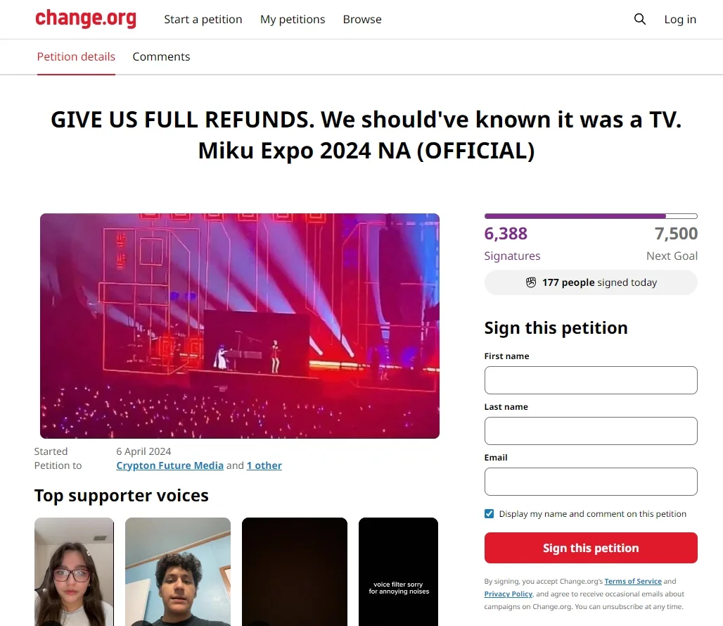 现在有不少粉丝发起请愿,要求Crypton和Crunchyroll给北美巡演门票全额退款,目前该请愿已经收到6千个签名支持。【图9】
