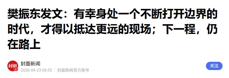 封面新闻 2026-04-23——樊振东发文:有幸身处一个不断打开边界的时代,才得以抵达更远的现场;下一程,仍在路上