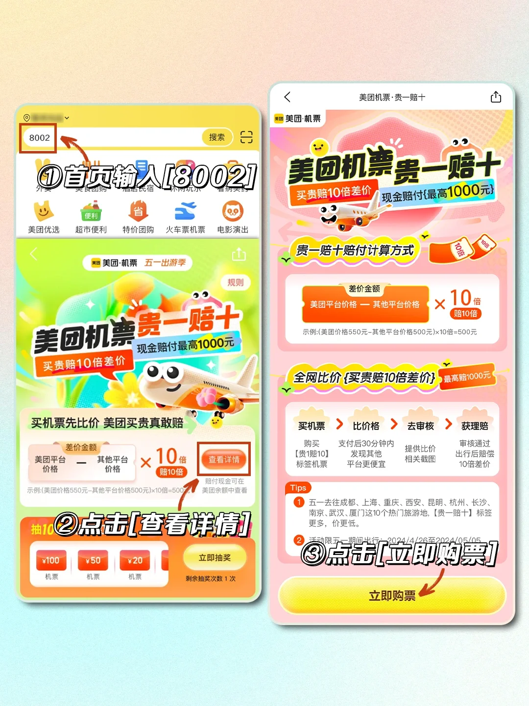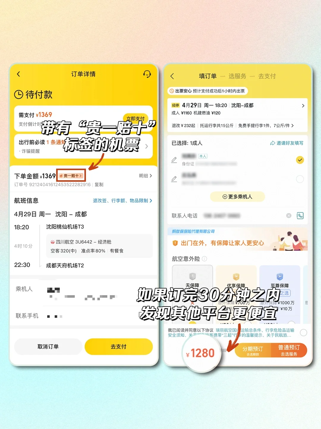 [飞机R]带有“贵一赔十”标签的机票,订完30分钟之内发现其他平台更便宜,梳入「8002」申请10倍票价差额赔付