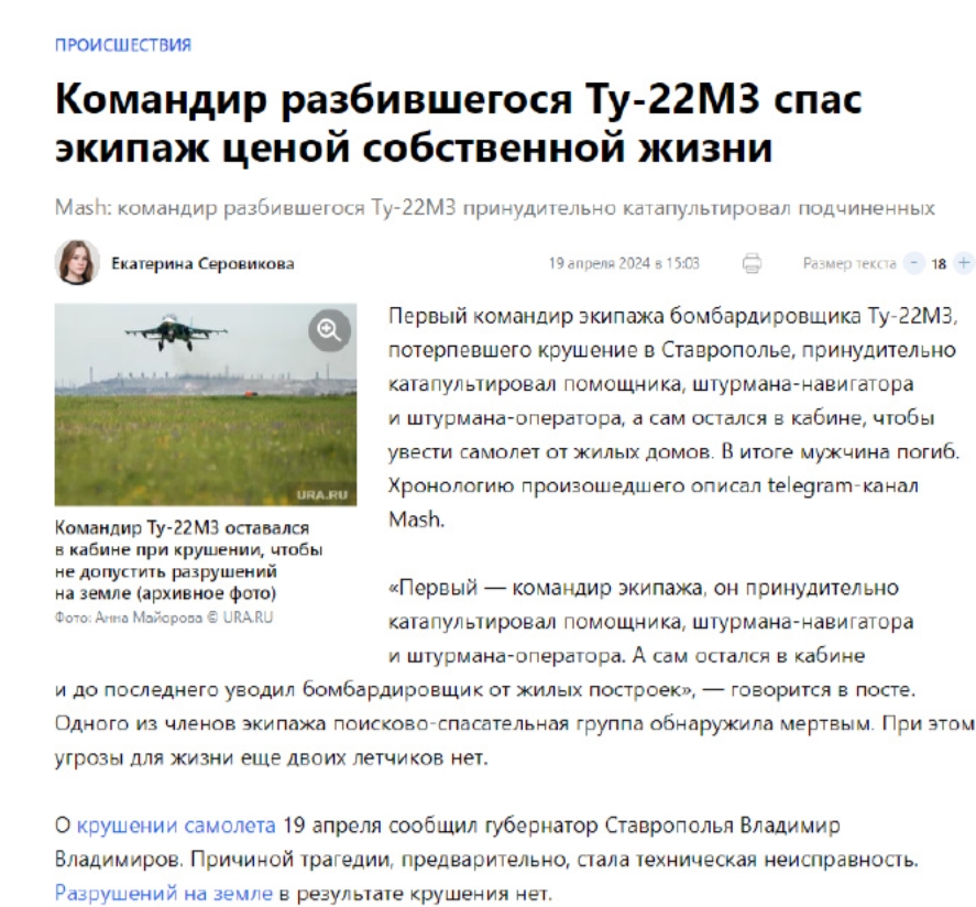 俄媒报,昨天因为机械故障坠毁的图-22M3轰炸机机长做了一件真正的英雄壮举——