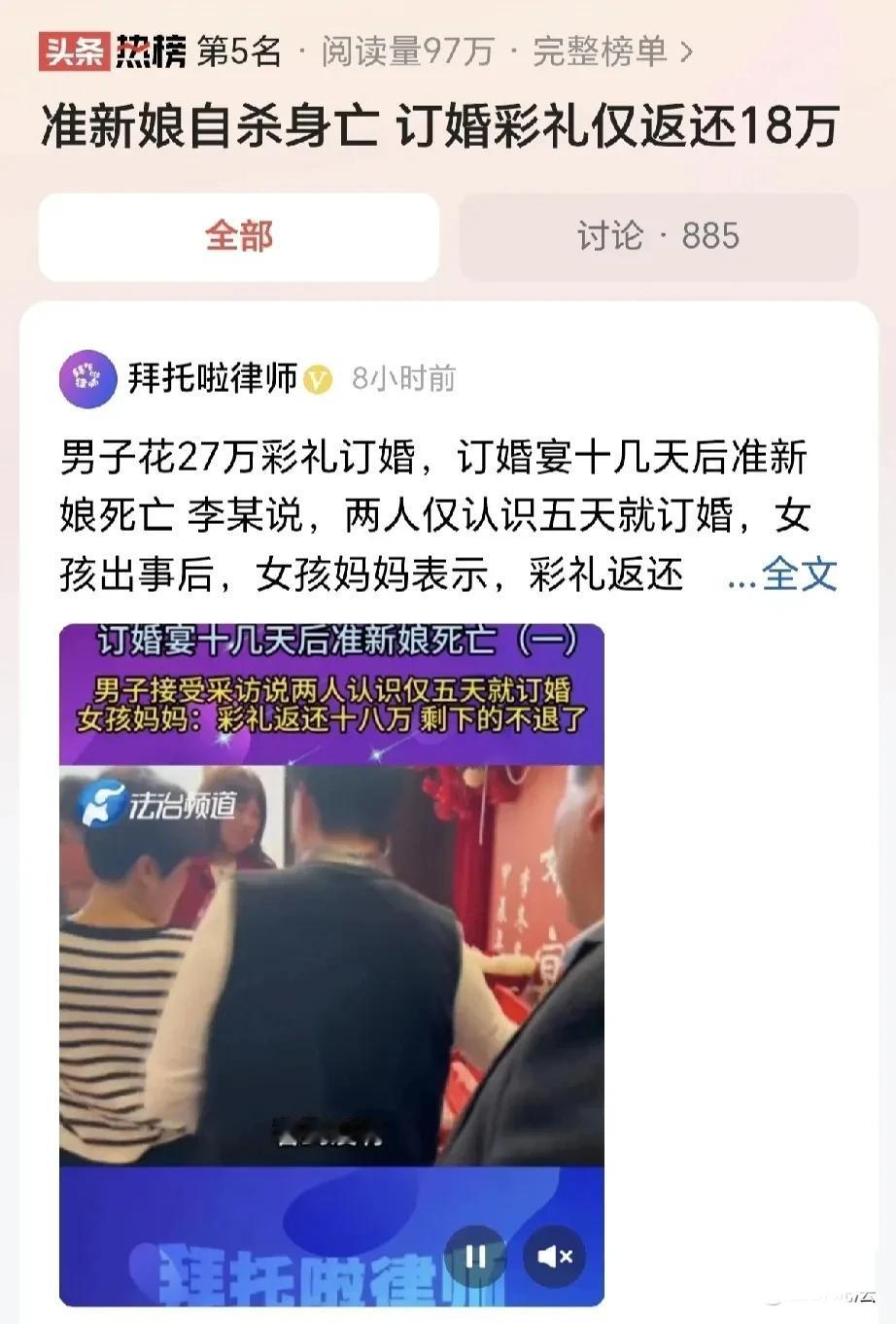 彩礼背后的悲剧:河南女子相亲5天就订婚,27万彩礼背后的心酸与无奈,10天后女子自杀,准新娘为何选择自尽?真的令人难以置信。才认识15天,女子就香消玉殒。 订婚的时候,准新郎给了27万元彩礼,寓意爱妻,是个吉利数字。 订婚后,俩恋人在微信上聊的热火朝天,情意绵绵。 因为准新郎在浙江上班。 所以,俩人都是在网络上聊天,增进感情。 但是,谁曾想到,人有旦夕祸福。 订婚10天后,准岳母给准新郎打电话说,自己的女儿跳河自杀了。 这是一个令人非常震惊的消息。 准新郎感到非常难过,自己的准新娘子跳河自尽,令他感到悲伤。 这个时候,自己家闺女已经跳河自尽,准岳母没办法,她给准新郎退回彩礼18万元。 悲剧了,这准新郎不但没有娶着媳妇,这还得搭上很多钱。 我觉得这丈母娘做的不地道。 自己的闺女到底死没死,这新闻里没有报道。 但是这彩礼没有全部返还给准新郎,这岳母做的有些得不偿失。 本来刚刚才认识15天,他们俩还没有结婚。 那27万彩礼,就应该全部给男方。 但是,丈母娘就给了18万,难道剩下的9万多,这丈母娘要独吞? 我觉得这些彩礼都应该还给男方。 朋友们,你们觉得这彩礼应该咋办?
