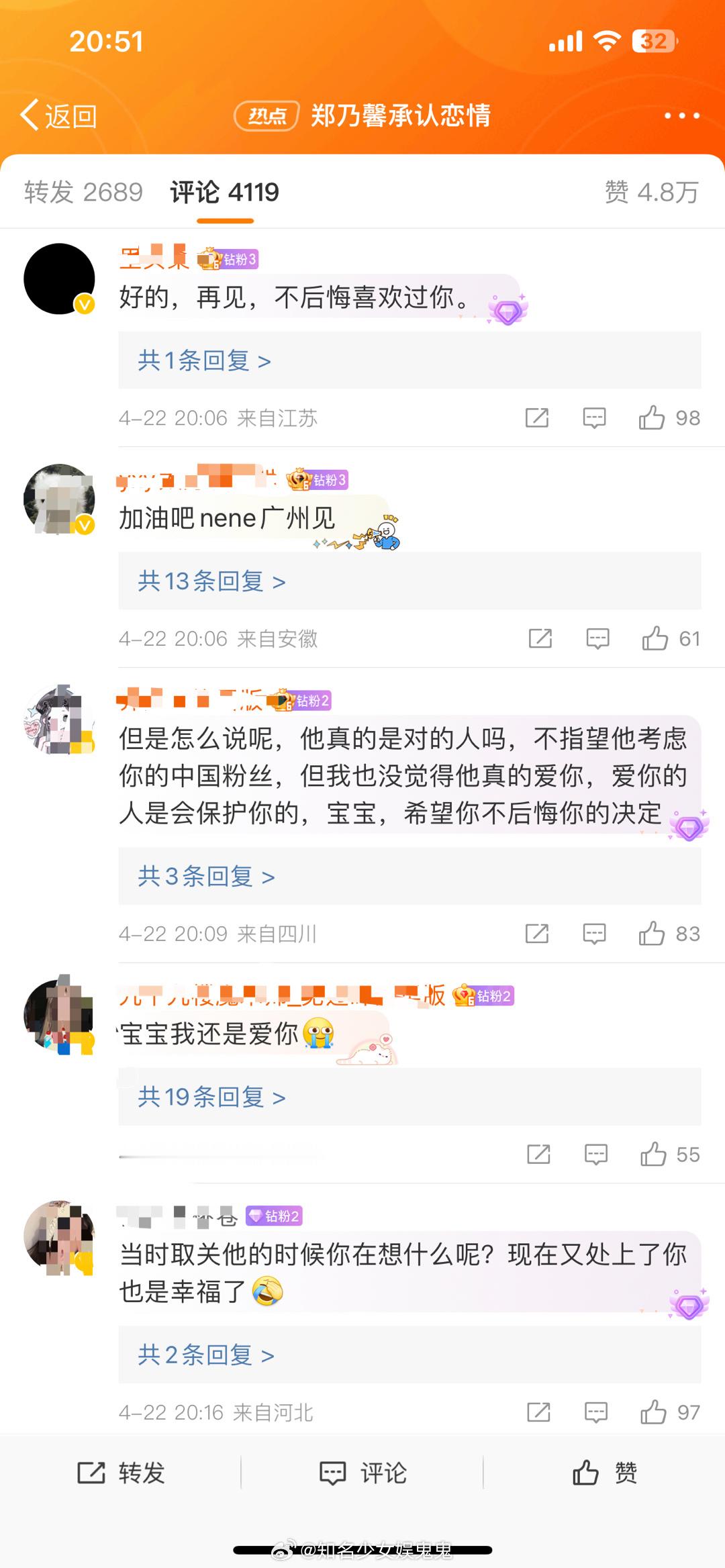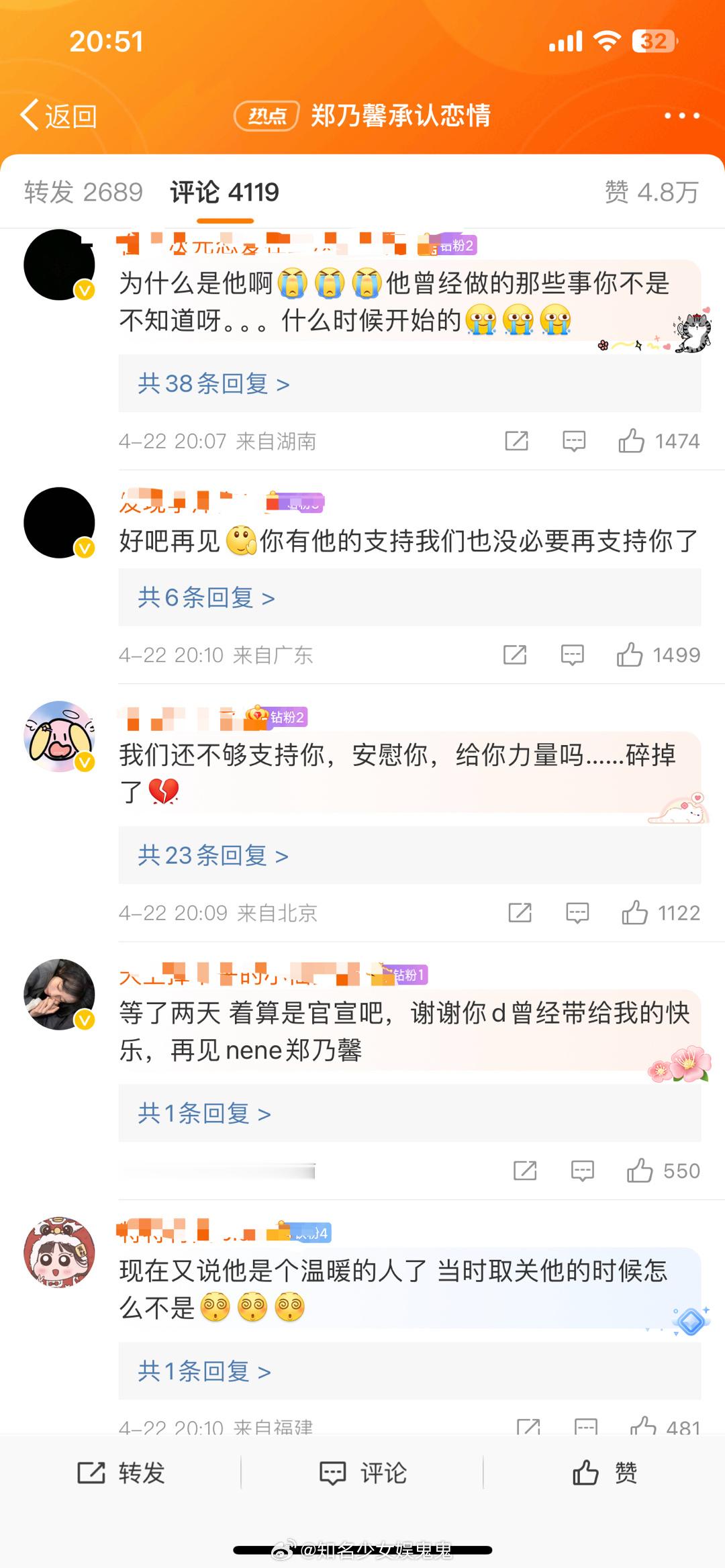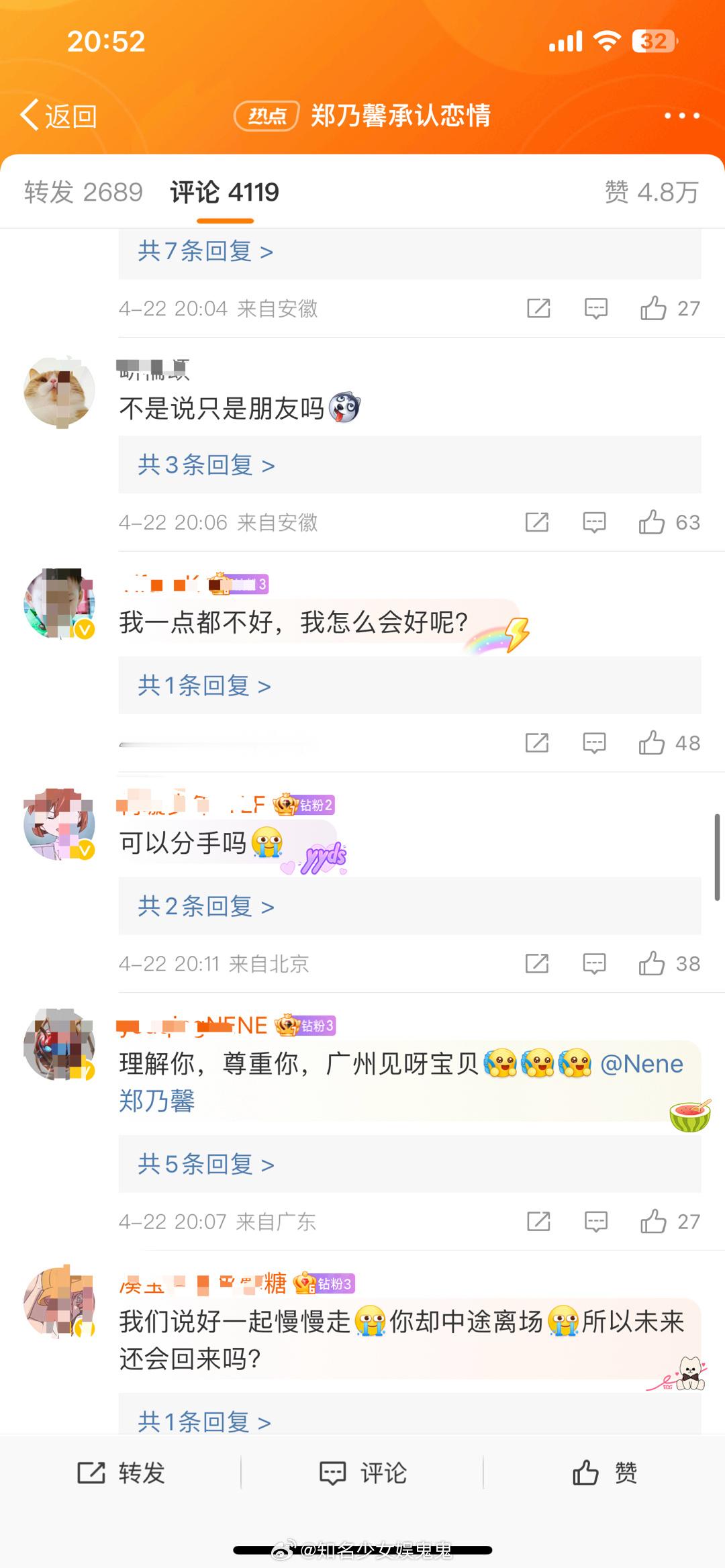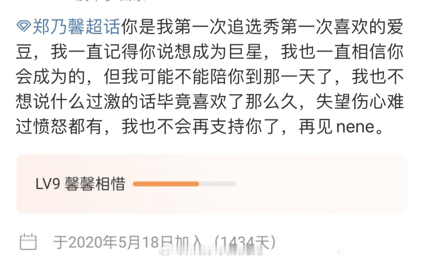 #郑乃馨承认恋情后的评论区#郑乃馨承认恋情后的评论区:“之前自己说过的话你全忘了”“我不太好,很想那个在初舞台上眼睛亮亮的女孩,那个有野心的甜妹,那个哭着说不要再为我撑腰了的你,1452天,那就停在这吧,谢谢你出来回应,让我彻底死心。”#郑乃馨的评论区#
