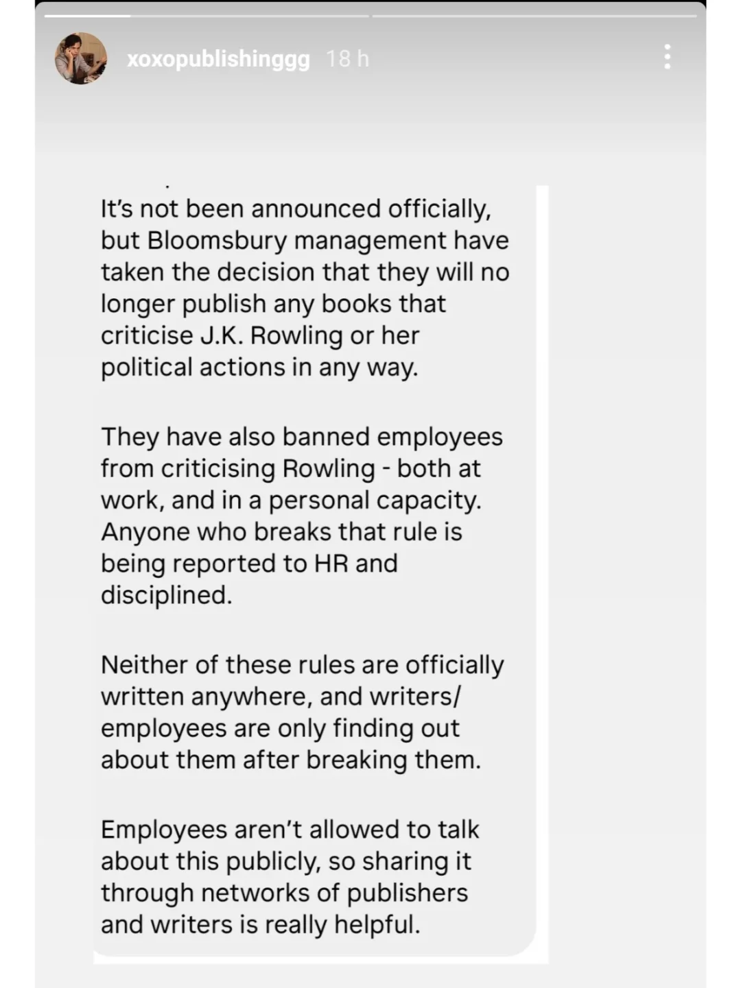 “虽然还没有正式的公告,但布鲁姆斯伯里已经决定不会出版任何反对J·K·罗琳以及她的政治立场的图书。”