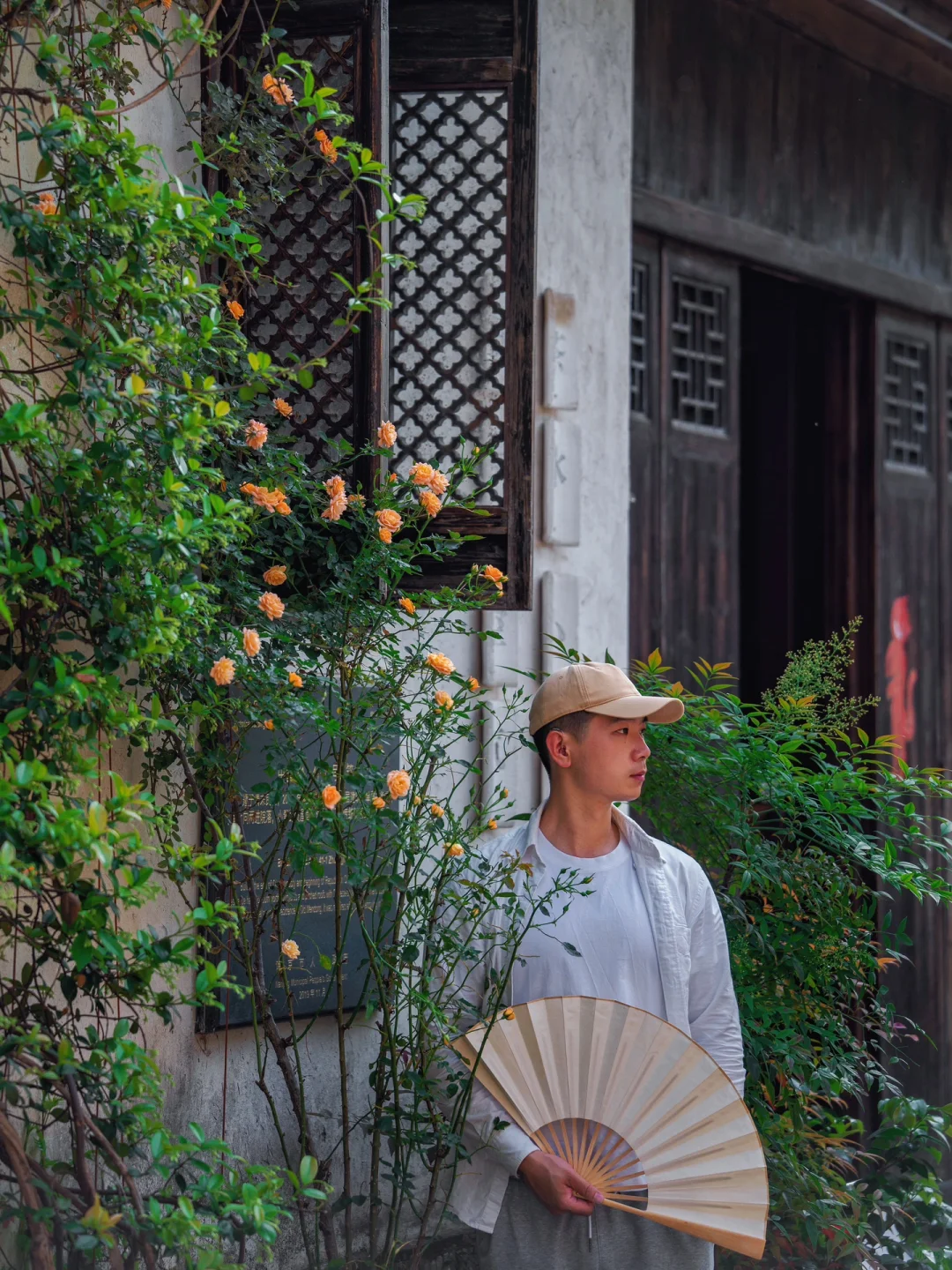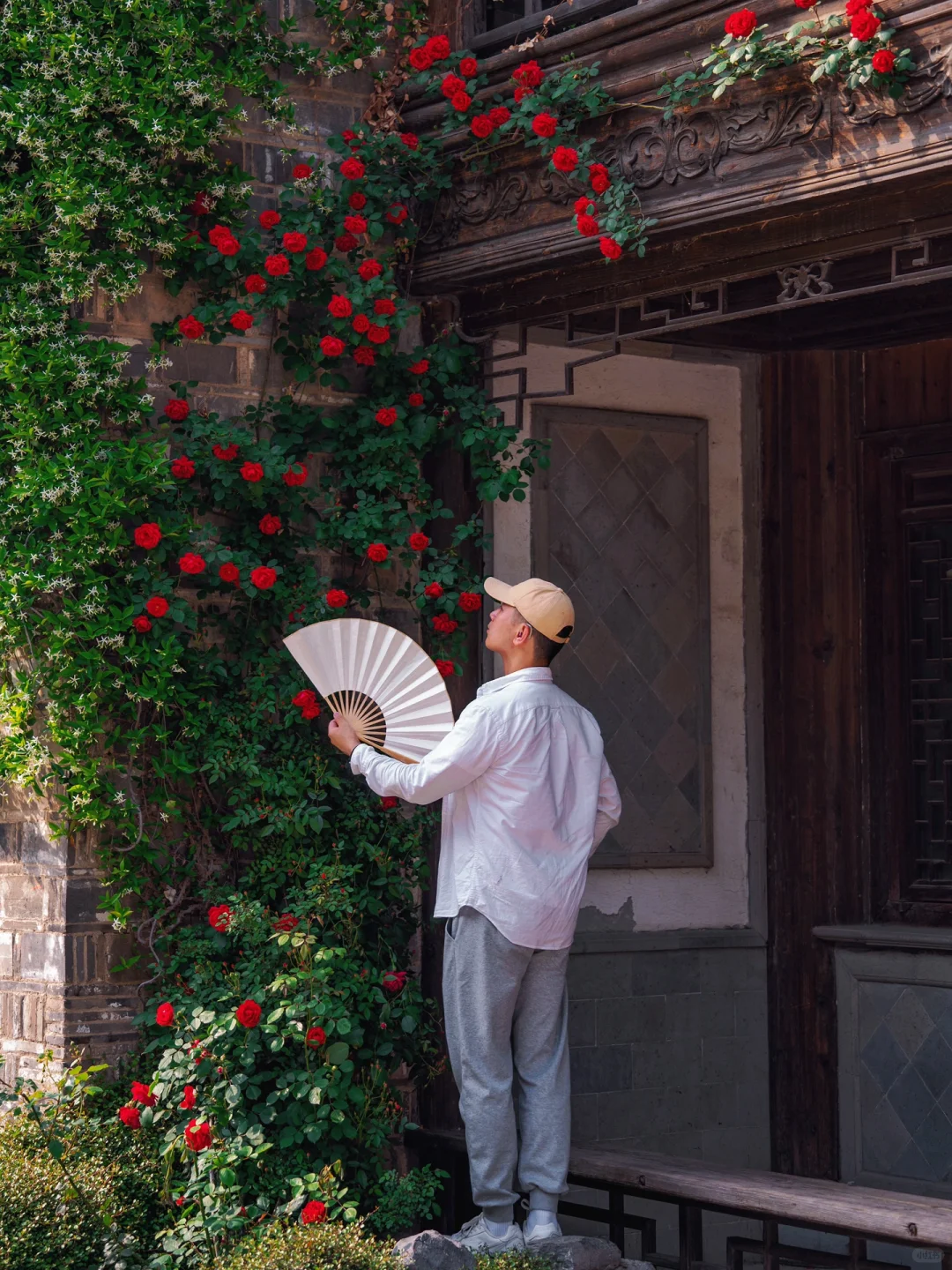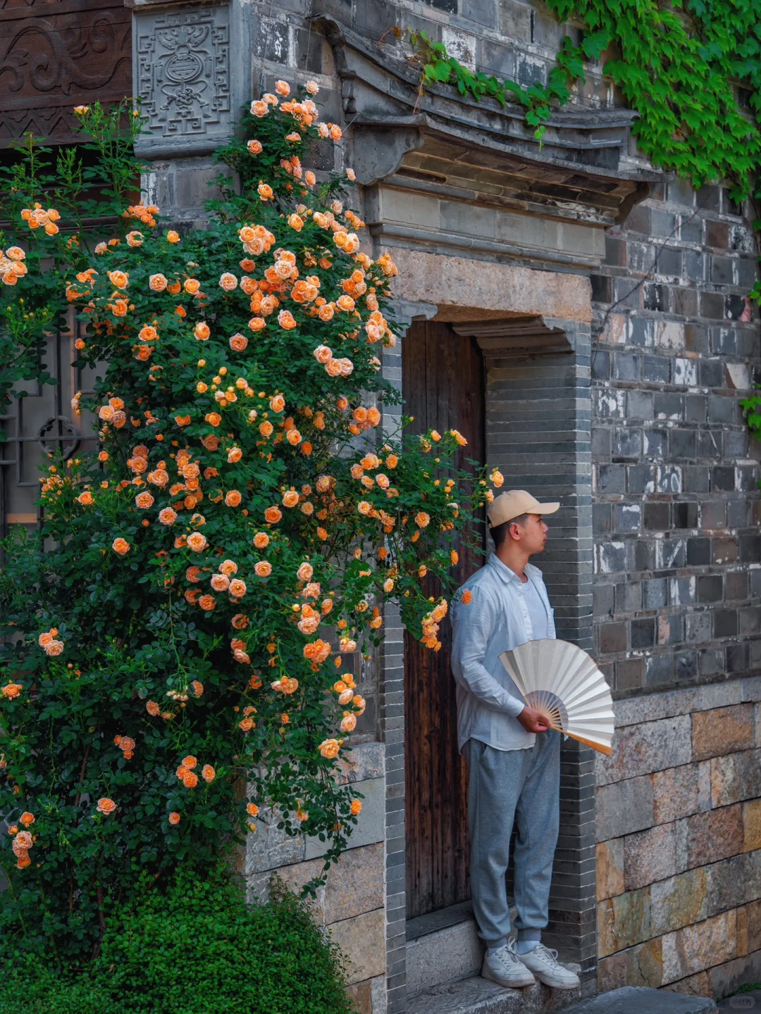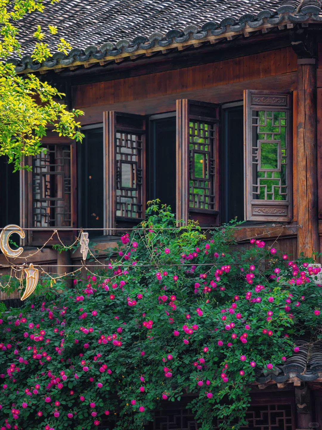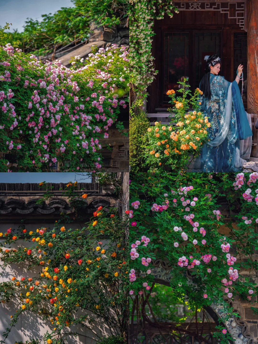 雕花木质门窗、瓦片屋檐、飞檐墙角…都被蔷薇花点缀了,也有几面墙蔷薇花开如瀑布,怎么拍都好好看~