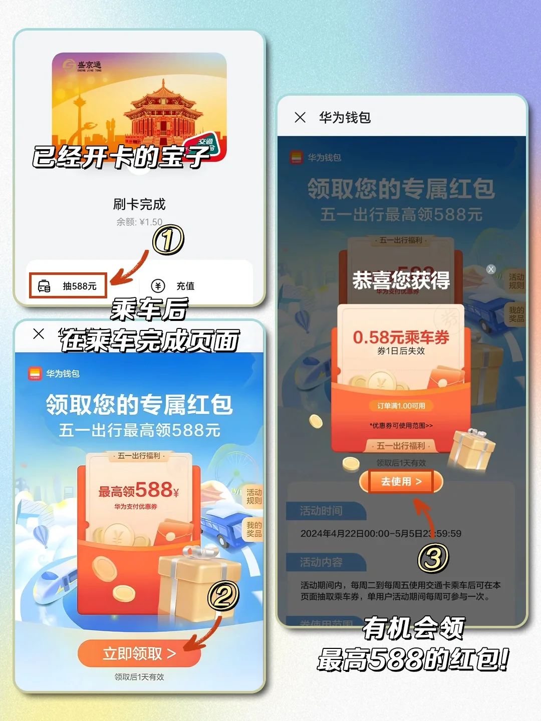 已经开卡的宝子,乘车后在乘车完成页面有机会领最高588的红包!