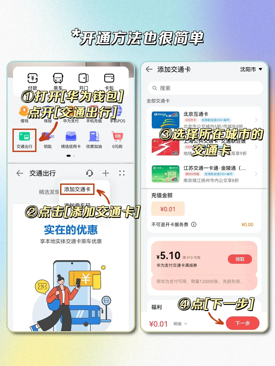 开通方法也很简单:打开钱包-交通出行-右上角+号-选择交通卡-按步骤开通-充值后就能用了!