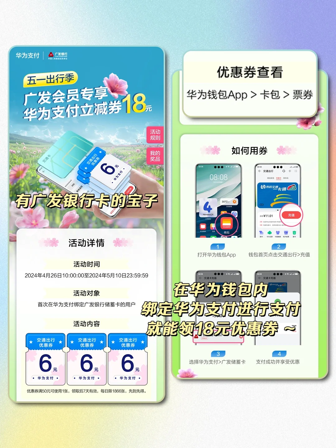 隐藏福利,有广发银行卡的宝子在华为钱包内绑定华为支付进行支付,就能领18元优惠券 ~快冲[派对R][派对R][派对R]