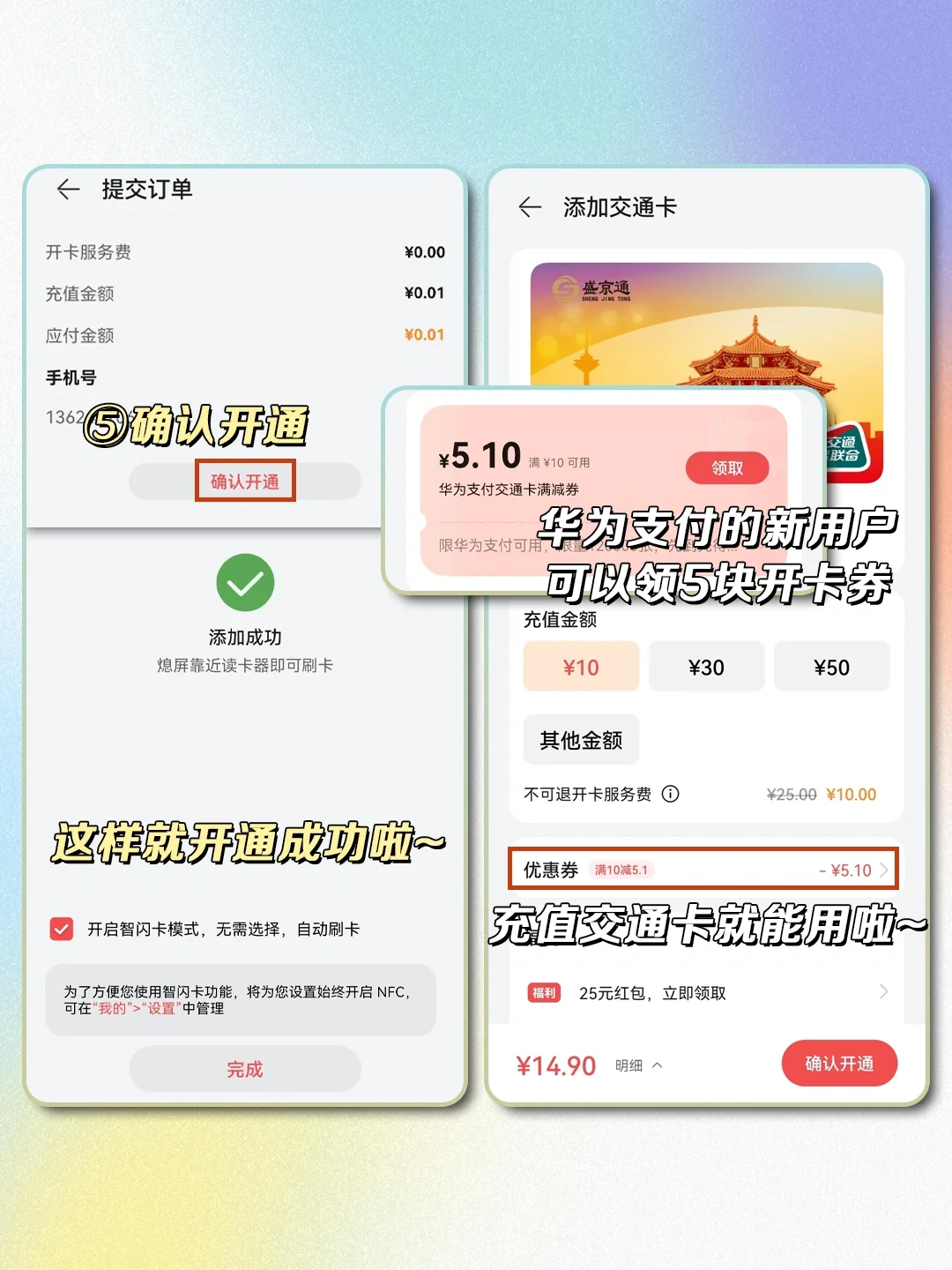 不仅开通free,而且还有福利!华为支付的新用户可以领5元开卡券,充值交通卡就能用啦~
