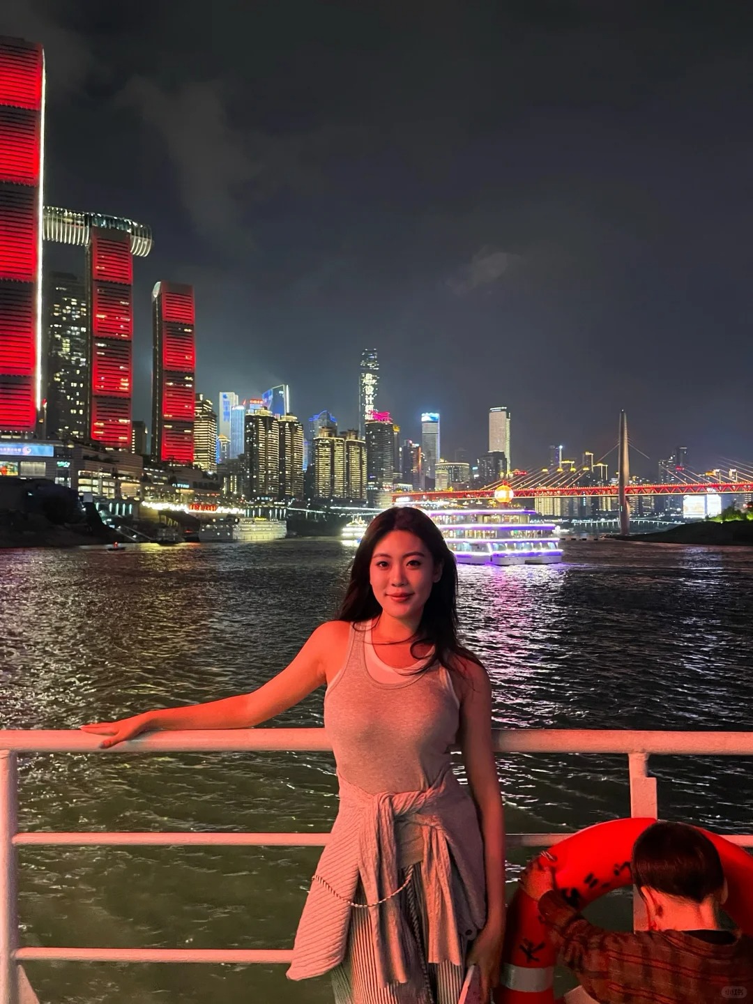 二百元的嘉陵江的晚风 两江游轮一定要坐! 买了船头的vip座位,不拥挤,拍照好出片,连我老公的拍照技术都可以!🫢可以很惬意的享受水果和小食,带小孩首选! 全程40分钟左右吧, 省钱小妙招:先买普通票138➕上船后补票80.人均218 普通票实在太挤了,工作日人都呜呜泱泱的 我个人认为这个是比较值得体验的。