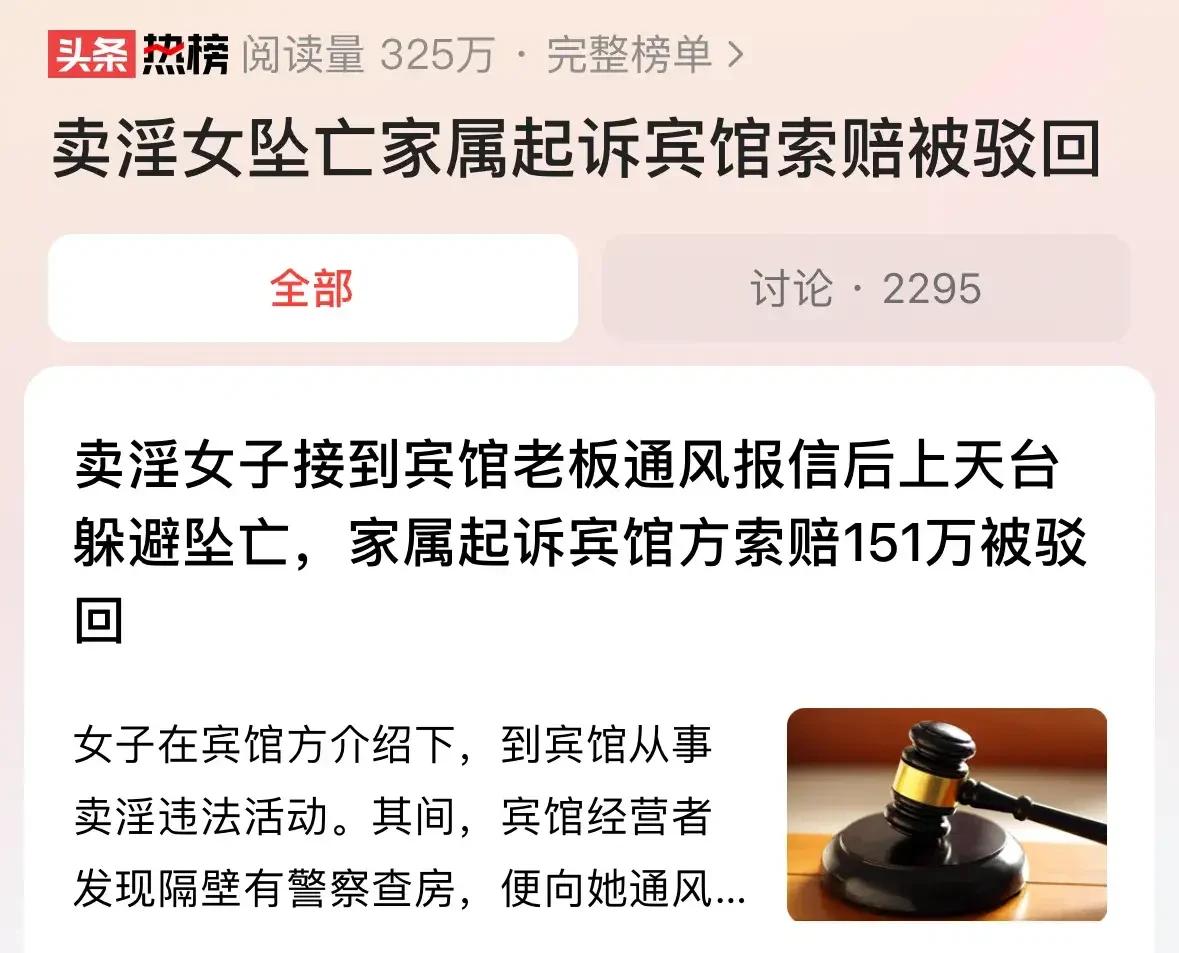 悲剧!女子卖淫因为150元在宾馆和男子交易,居然把命丢了,命丢的令人难以置信,但生命无价,还是为她感到惋惜,这卖淫女和宾馆老板是一伙人,她接到宾馆老板报信说警察查房,卖淫女匆忙上天台躲避,却坠亡,不幸的是,她坠亡后五天才被发现,现在,卖淫女的父母要求宾馆赔偿151万。 事情发生的很突然,女子因为害怕,又因为觉得丢人,她躲在宾馆的5楼天台,不知道为啥,不慎坠楼而亡。 事情发生在重庆市彭水县。 当时,卖淫女正在宾馆和一男子进行交易,正在卖淫的时候,不知道啥原因,警察突然要来查房。 这宾馆老板得到消息,就把这个消息告诉了卖淫女。 该女子就慌了,也不管那男嫖客了,爱咋咋地,先把自己摘干净再说。 该女子被警察查房吓坏了,自己偷偷摸摸跑到酒店的5楼天台上,去躲避警察的查房。 她可不愿意让警察抓个正着。 那就太丢人了。 毕竟她做这一行,除了宾馆老板知道,其他人都不知道。 毕竟她做这丢人现眼的勾当不是一天两天了。 主要她在自己家门口干,人要脸树要皮的,如果街坊邻居知道这个事情,她爸妈那不得疯狂。 所以,她都没有考虑,就直接跑五楼天台上。 谁曾想,那男客人都走了,这女子还是没有从楼上下来。 这宾馆老板就觉得奇怪,这人去哪里啦? 但是,宾馆老板也没有细找,以为她从别的地方逃跑了。 万万没有想到,五天后,这宾馆老板的男朋友在楼下的水沟里,发现了已经死亡的该女子。 原来,她想从天台上爬下去的时候,不小心掉下去摔死了。 当时,谁也没有发现她的踪迹,直到5天后她才被发现,可惜已经死亡。 报警后,经警察鉴定符合高坠伤死亡。 事情发生后,女子父母和宾馆老板达成调解协议,支付了6万元的丧葬费。 但是,该女子的父母还是觉得女子死的有些冤枉,就把宾馆老板告了,要求赔偿151万元。 但是,法院驳回该女子父母的诉求,维持原判。 这宾馆老板收留卖淫女,给卖淫女提供客人,她已经触犯了法律。 但是,该女子上天台,是女子自己的行为,都是成年人,要为自己的行为负责。 这个事情,发生的令人难以置信。 如果该女子不做这个营生,她就不会坠落。 如果宾馆老板不给她介绍客人,做这个买卖,或许不会发生这样的惨剧。 劝慰那些做这种营生的女子,赶紧悬崖勒马。 还有那些宾馆老板们,别为了蝇头小利,就做出犯法的事情。 每一个从业者都要守法经营,遵循道德的底线。