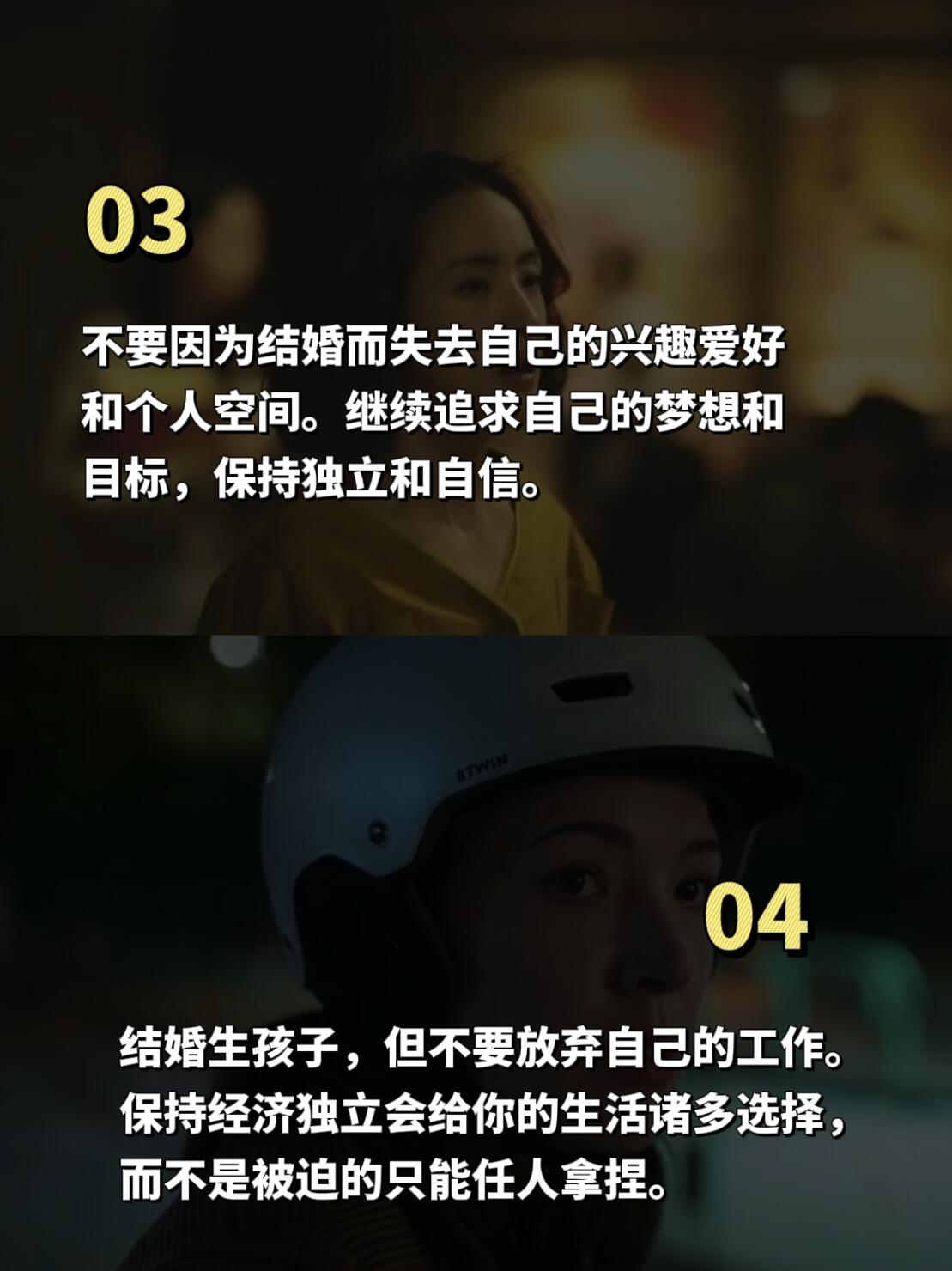 3.不要因为结婚而失去自己的兴趣爱好和个人空间。继续追求自己的梦想和目标,保持独立和自信。