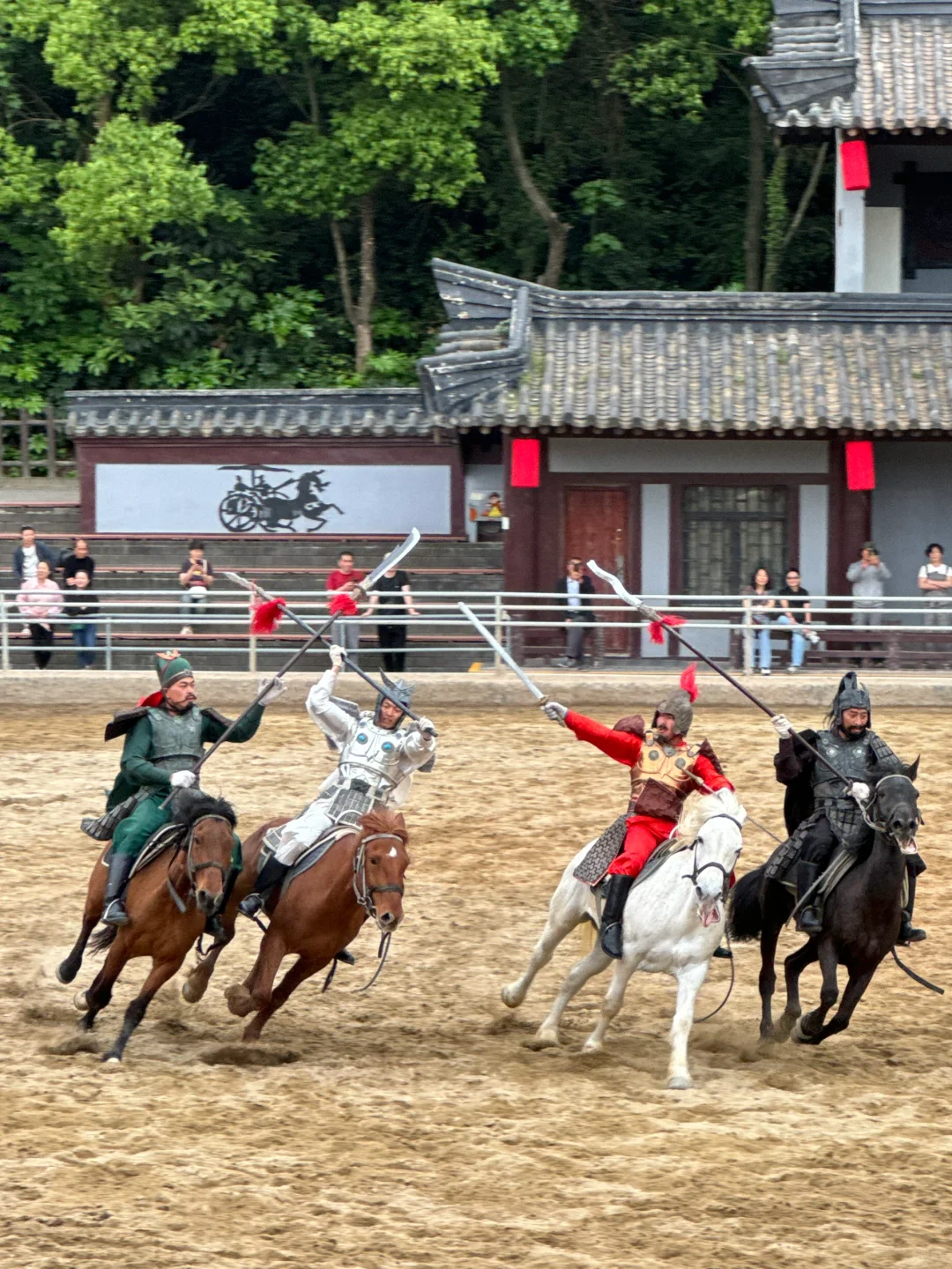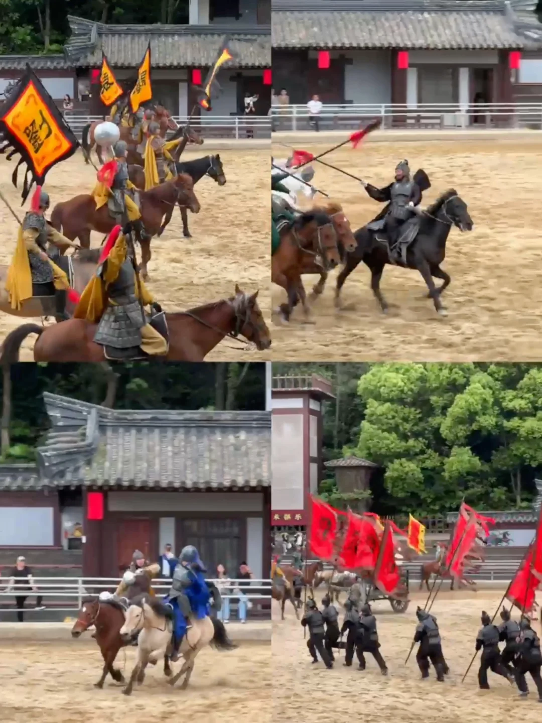 ❺三英战吕布:真人实景骑马大战,再现《三国演义》中刘关张酣战吕布的场面,场地内扬起一阵沙土,让人有种身临战场的感觉~