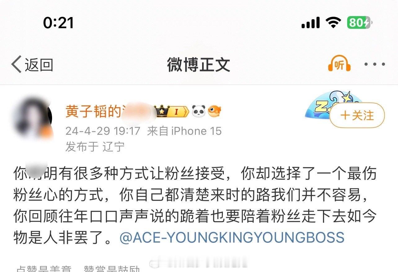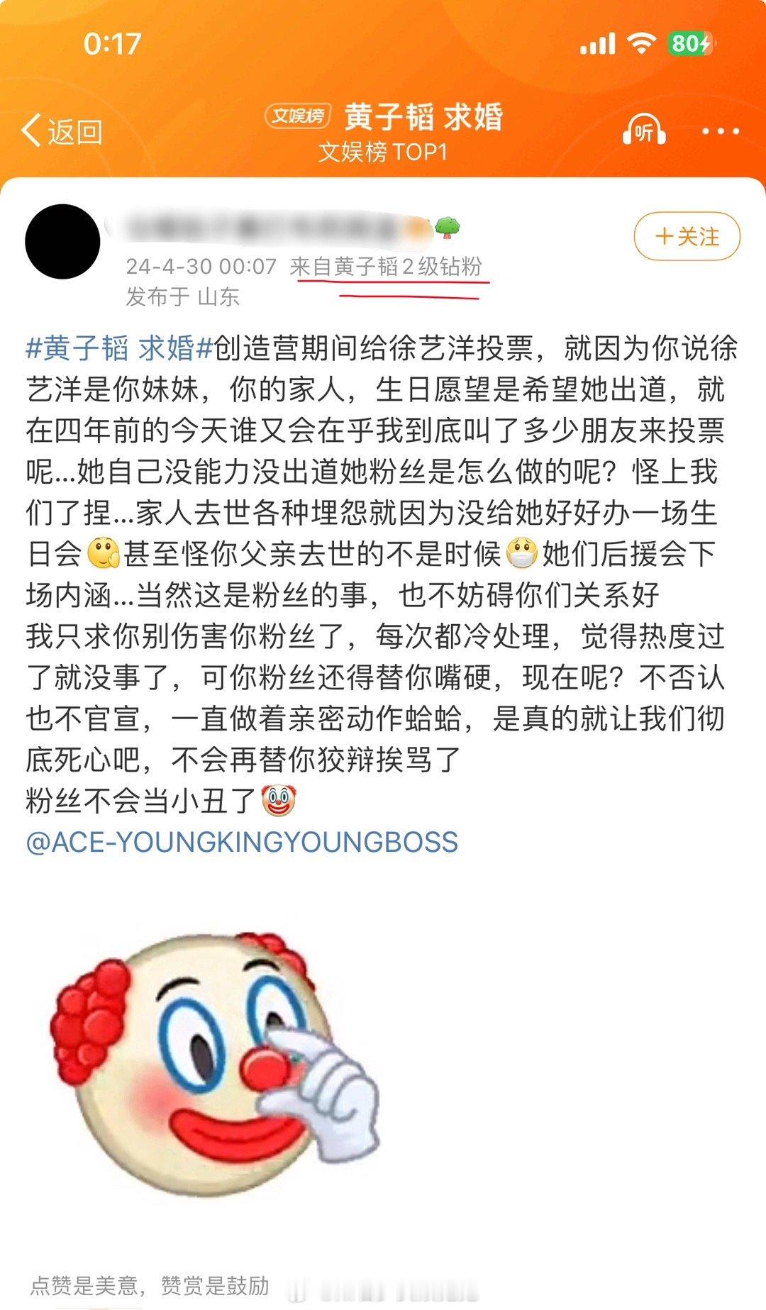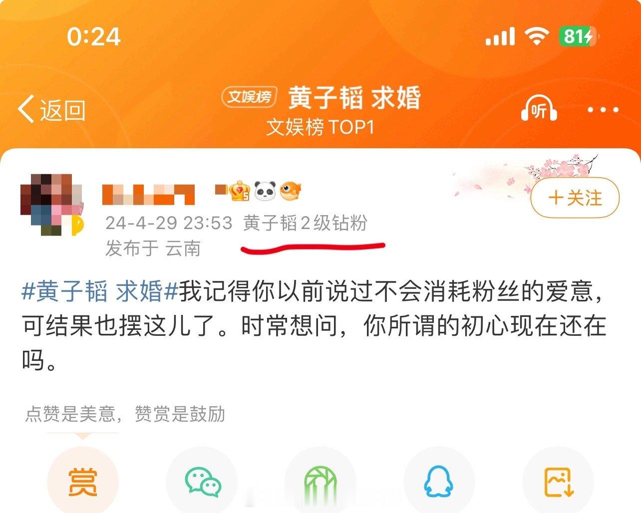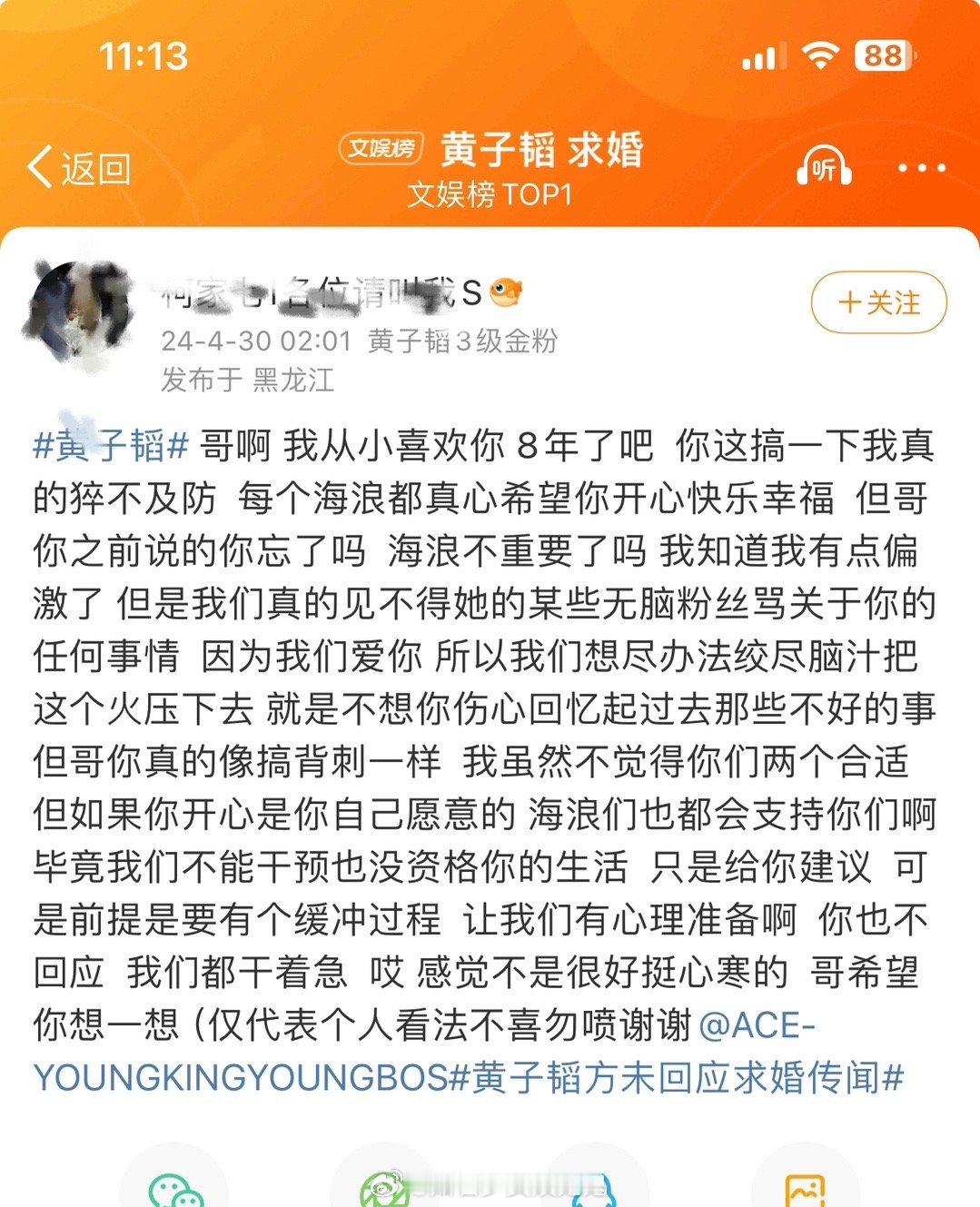 #黄子韬粉丝发文#黄子韬疑似求婚徐艺洋,粉丝发长文称:“明明有很多种方式让粉丝接受,你却选择了一个最伤粉丝心的方式,前几天看到你们的照片了,但是心疼你被骂,所以买断了,只想让你少挨一些骂,不想看到你被嘲,自己反倒做错了