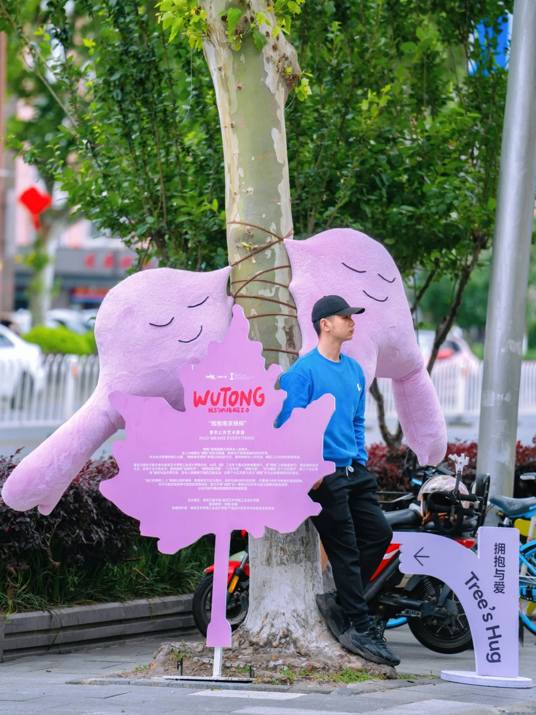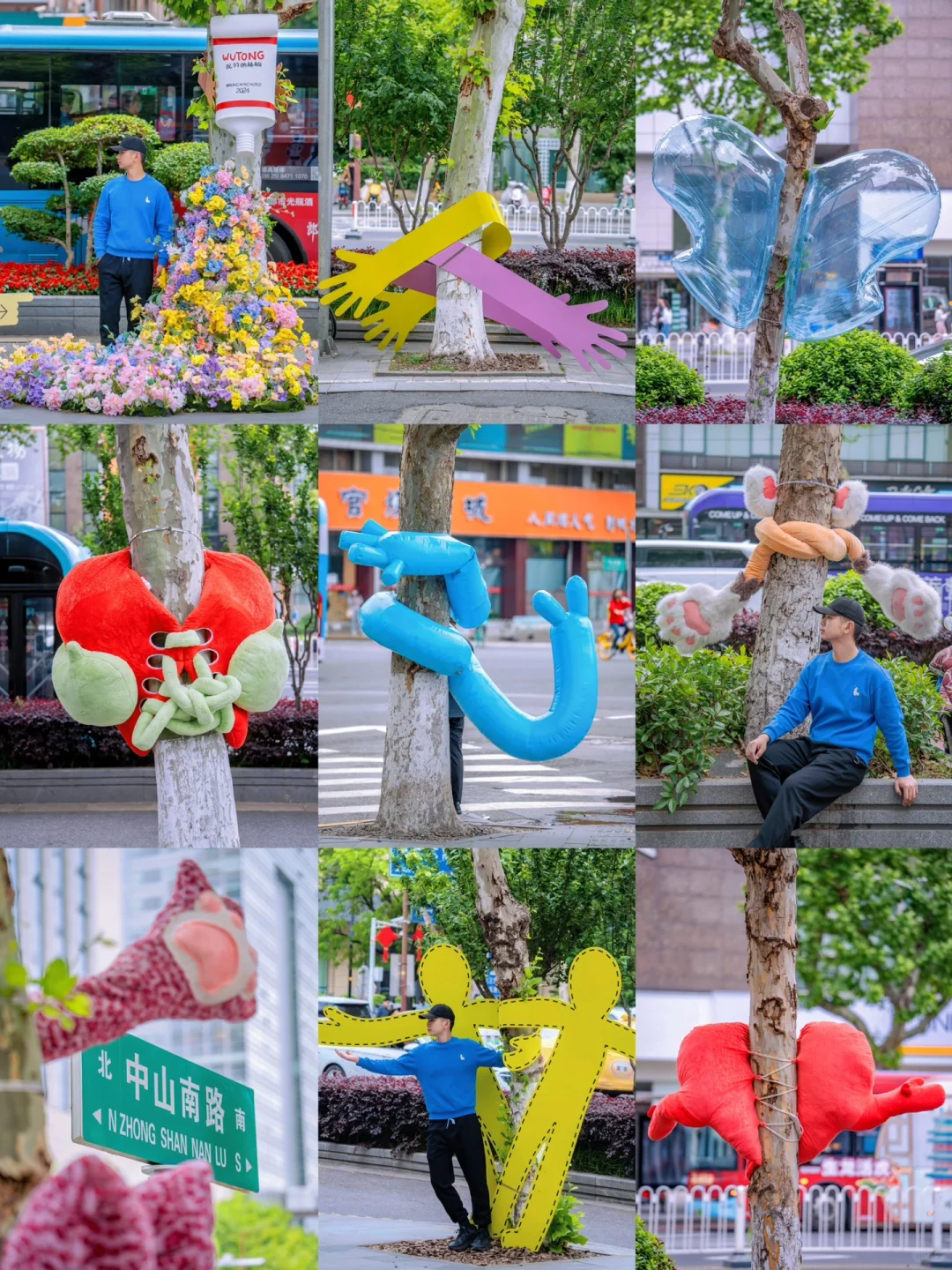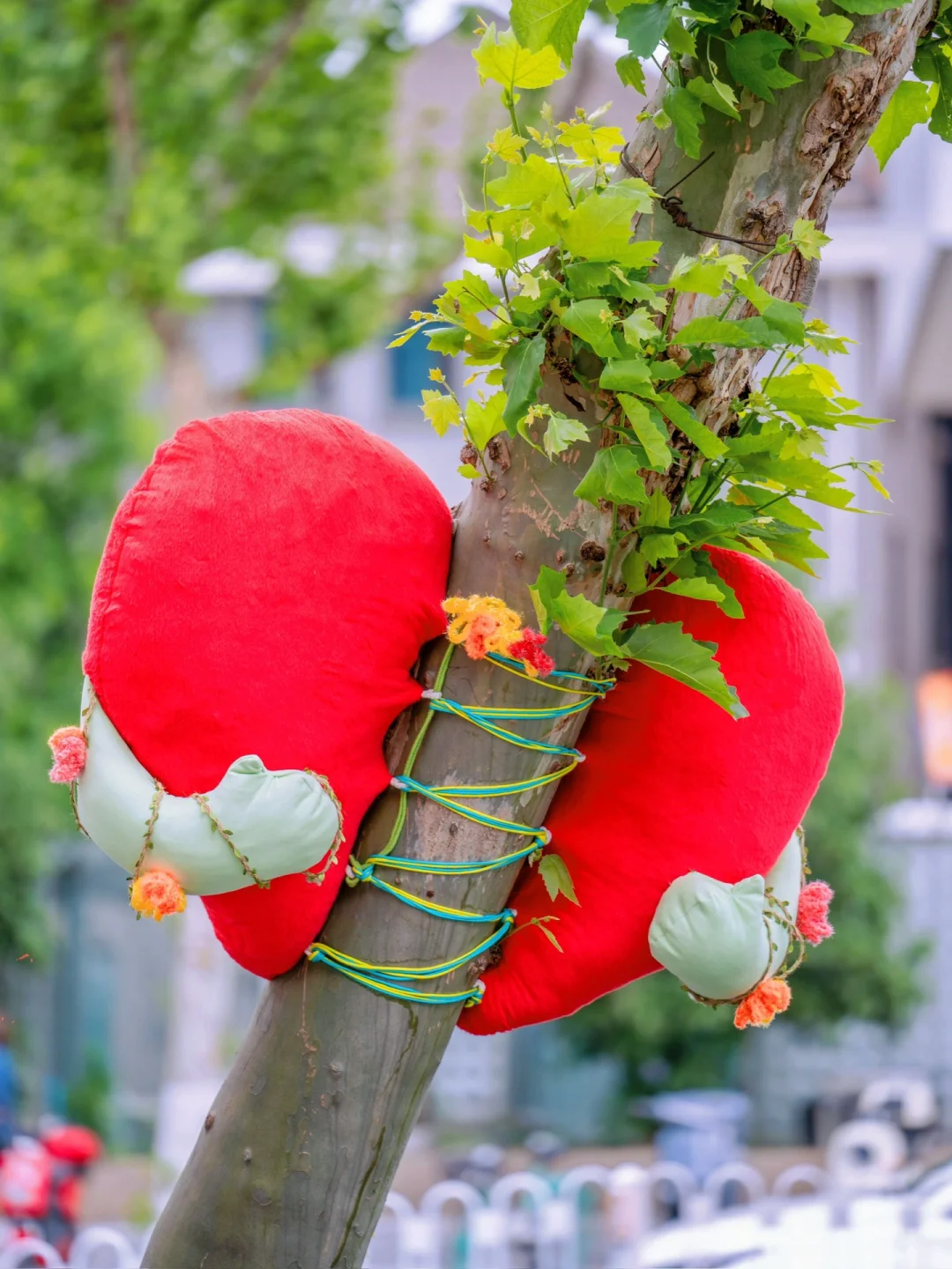 这个街道的每棵梧桐树都穿上各式各样“衣服”~每一棵梧桐的拥抱姿势都不一样,创意又可爱~