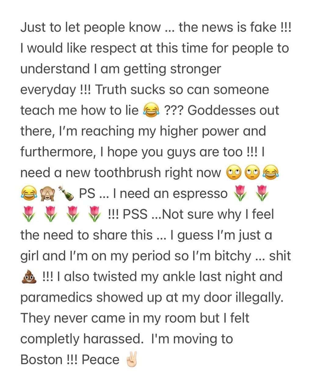“我只是想让人们知道......新闻是假的!!!此时此刻,我希望人们尊重我,理解我每天都在变得坚强!!”