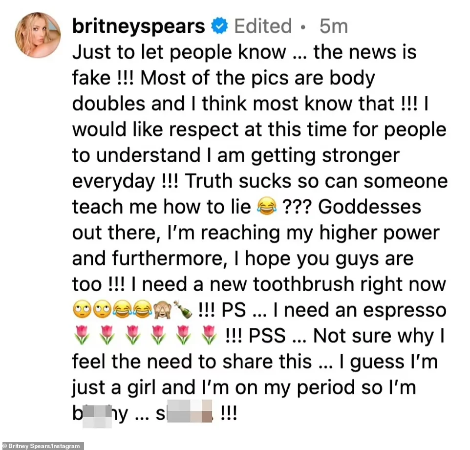 在TMZ的新闻报道出后,布兰妮在ig上发文辟谣,表示图片里的不是她,是她的替身(扮演者):