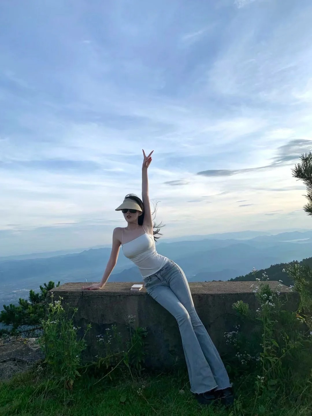 浅蓝色低腰喇叭裤我的最爱 爬山拍照