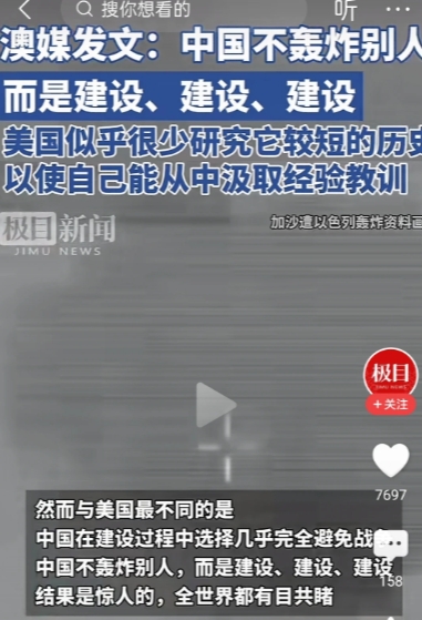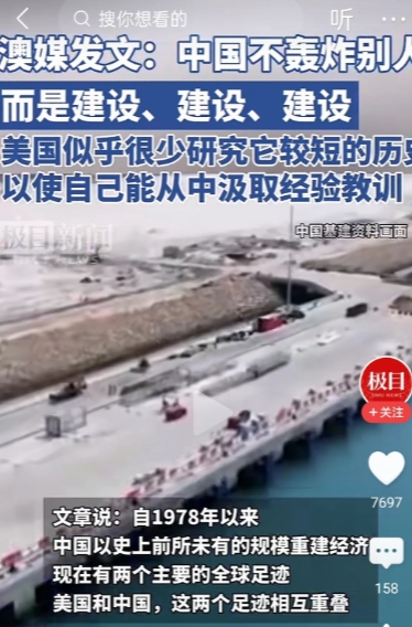 澳媒表示,1978年以来,中国以前所未有的规模重建经济,美国和中国的发展轨迹相互重叠。但是与美国不同的是,中国在发展过程中避免战争,中国不轰炸别人,而是不断的建设,结果是惊人的,全世界都有目共睹。