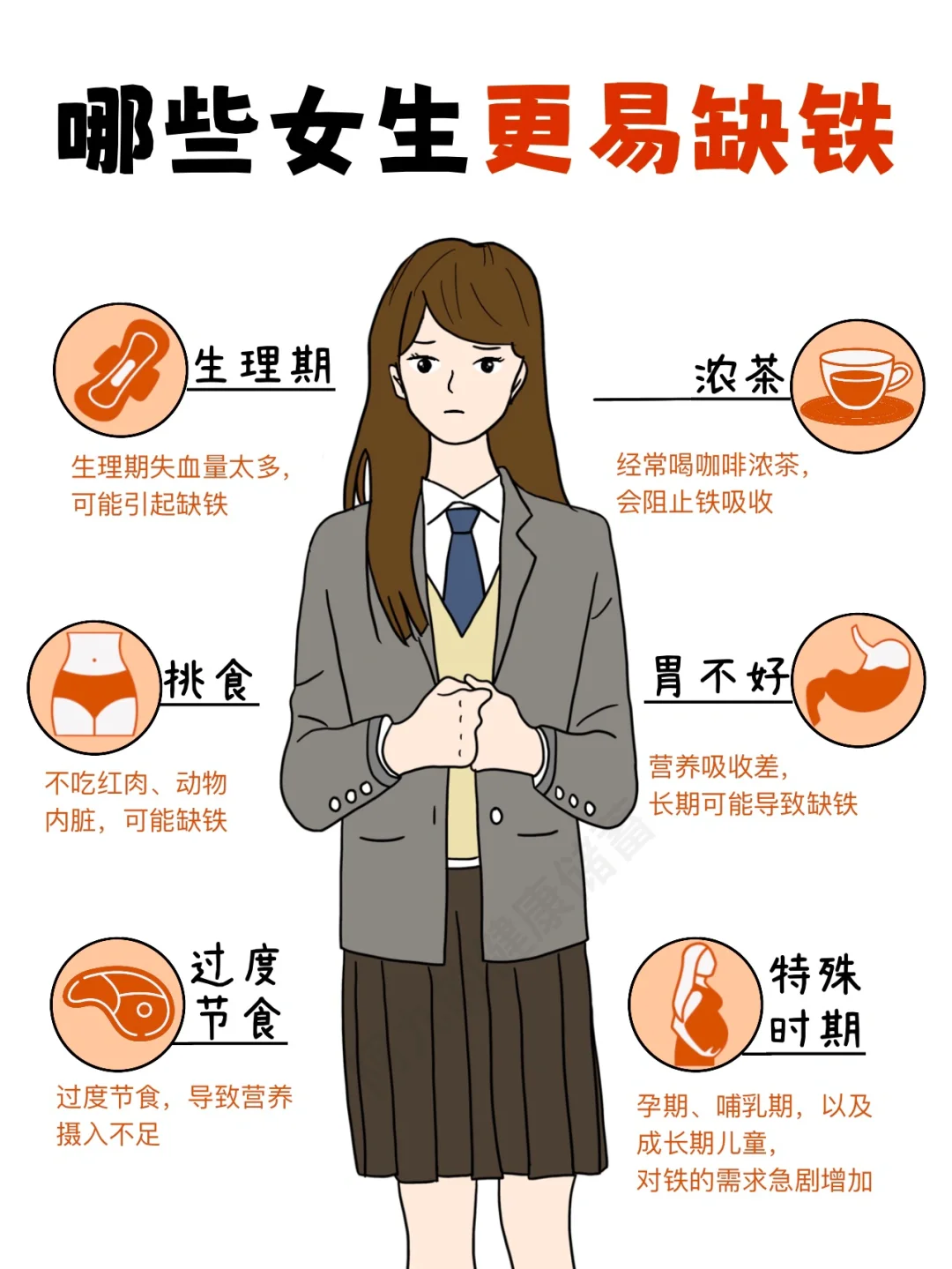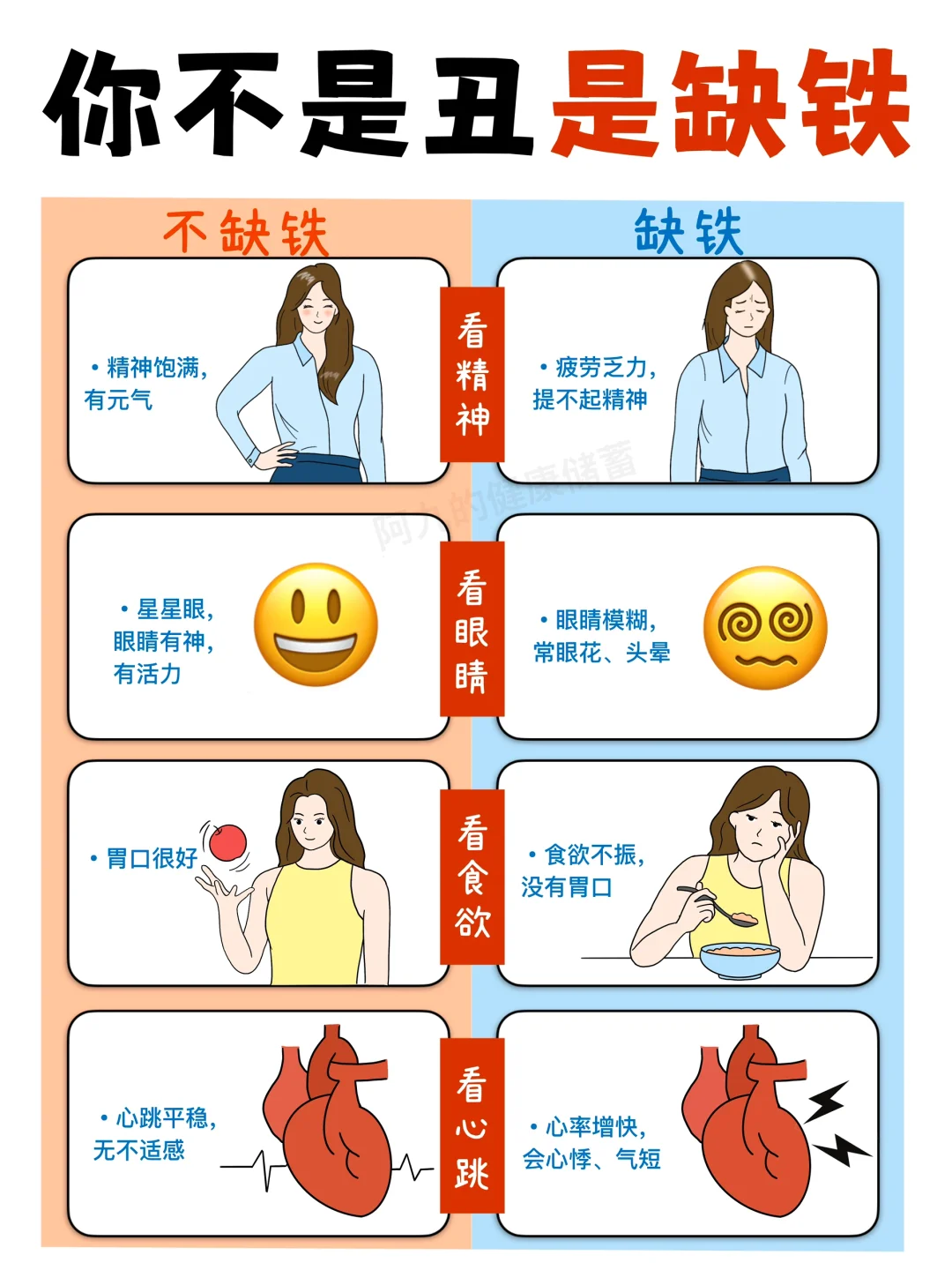 面色惨白没血色、手脚冰凉、姨妈量少等等都可能是缺铁的表现,中了这些情况的姐妹可真得做做功课,研究研究怎么补铁啦~