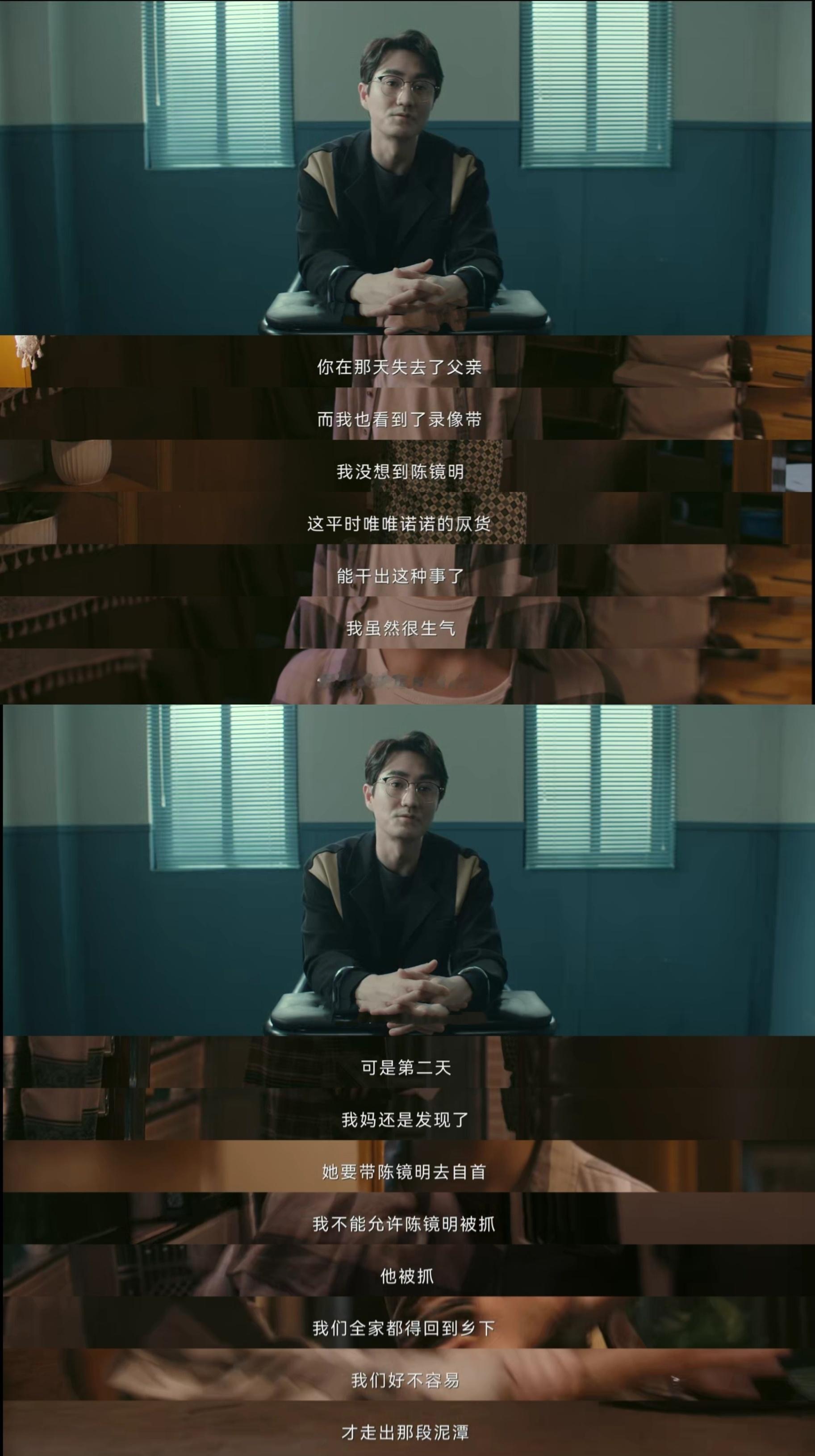 #不可告人片名的含义# 看完不可告人最后三集才发现陈家栋的疯批原来早就有迹可循。在妹妹陈雪迎的回忆中,父母争吵间导致母亲坠楼身亡,但是二刷后发现,镜头给到腿部时是穿着牛仔裤的人,并不是当时西装革履的陈镜明。通过最后一集陈家栋被捕后的供述回忆,是自己不想回到农村生活,所以参与了父母之间的争夺,失手导致母亲坠楼,衣服细节都对应上了,导演埋了好大一个伏笔,第一次看的时候根本没注意!#不可告人二刷才能看懂的细节##网剧不可告人#