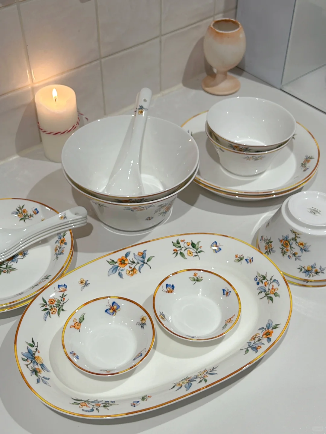 老破小大家都知道,大部分就是外观楼道偏脏乱破,小广告满墙,除了这两点,其他问题不突出。 即使外在不行,咱就得修内在,作为i人大部分就是在家,把家里装的温馨舒服很重要!!! . 就像虽然我也不经常做饭🍳,但厨房要装的很复古喜欢,该有的都要有,实用又好看,哈哈哈哈哈开工在即,炫几道菜,煮几款汤圆,用上新入的玛戈隆特的和美家园系列骨瓷餐具,整体轻薄清透,绽放的黄色花卉搭配淡雅的蓝绿叶子,有一种雅致的明亮,吃饭也会很有食欲~ . .