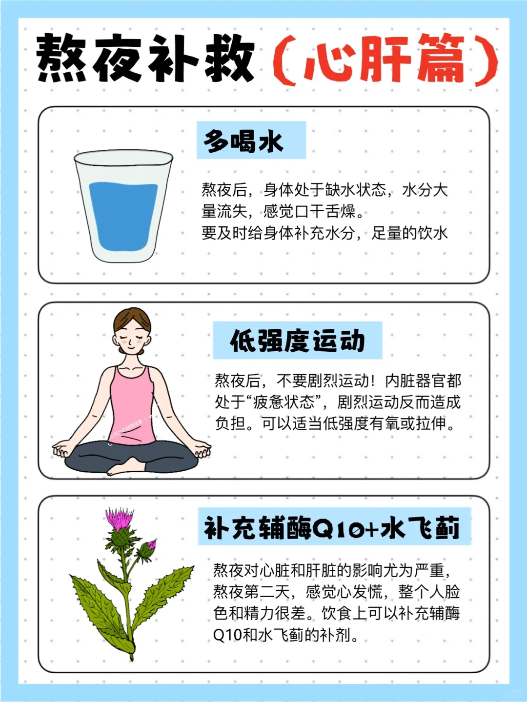 另外熬夜后千万不要剧烈运动,如果想运动就适当做些低强度有氧或拉伸;