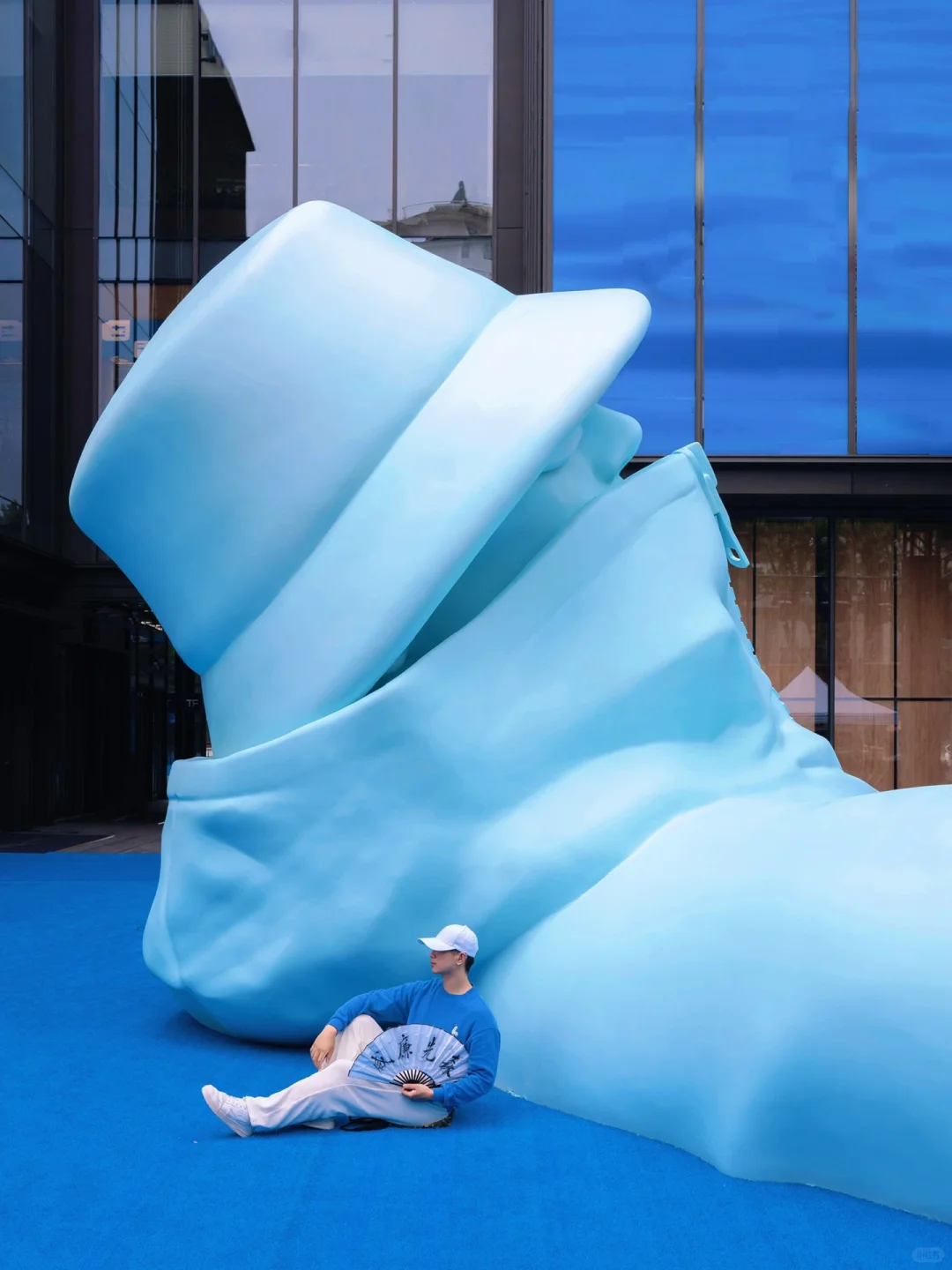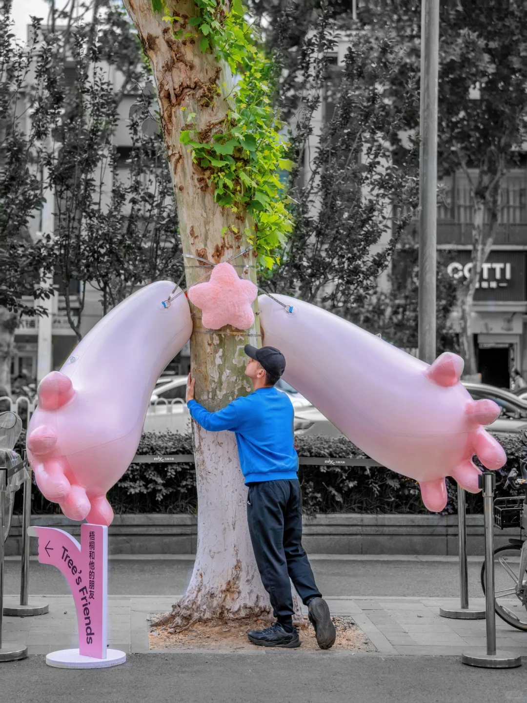 出来可看到,这个街道的每棵梧桐树都穿上各式各样“衣服”,还有比心的杜杜和蓝色巨人也都在门口,很好拍~