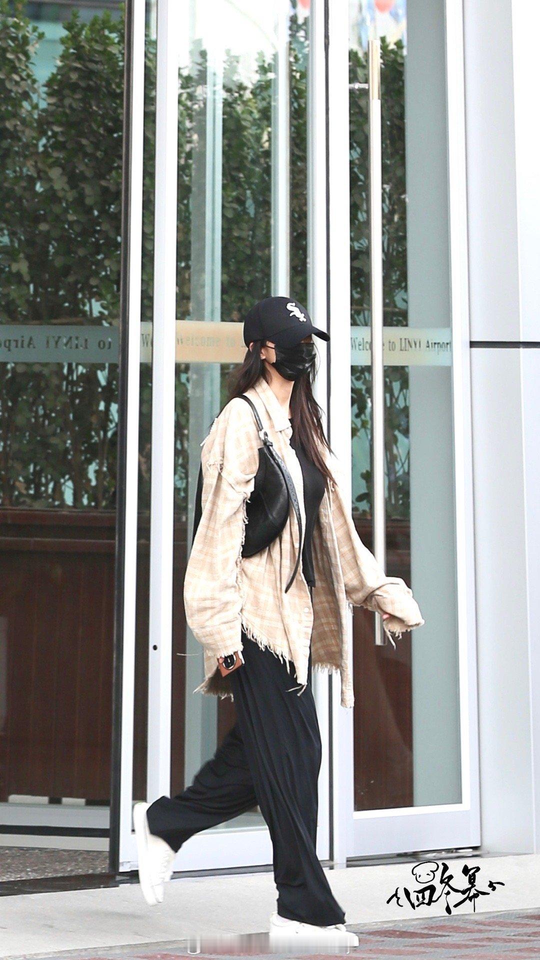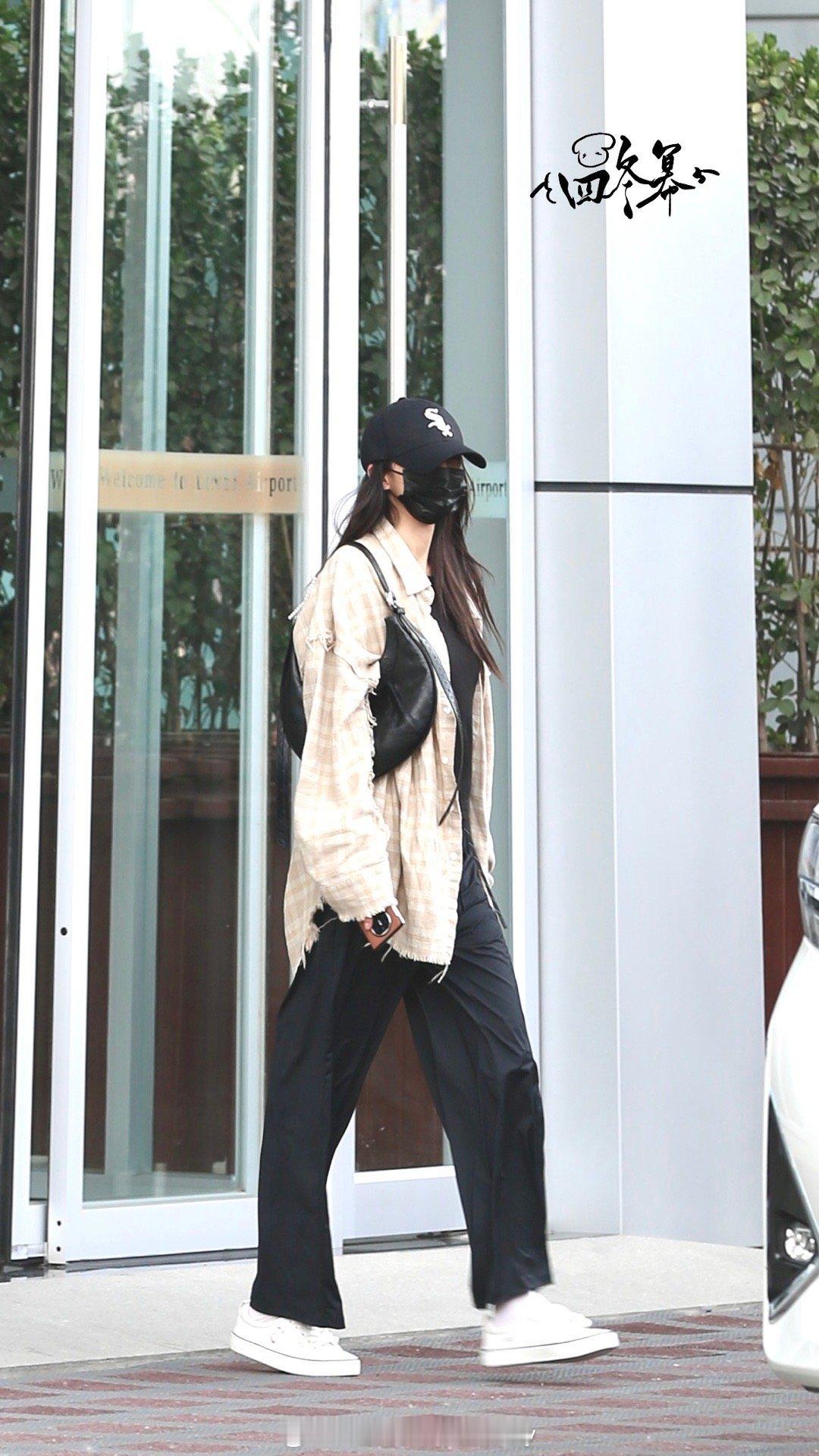 杨幂今日的机场私服解析,男友风衬衫搭配黑色防晒裤,演绎休闲舒适的日常通勤look