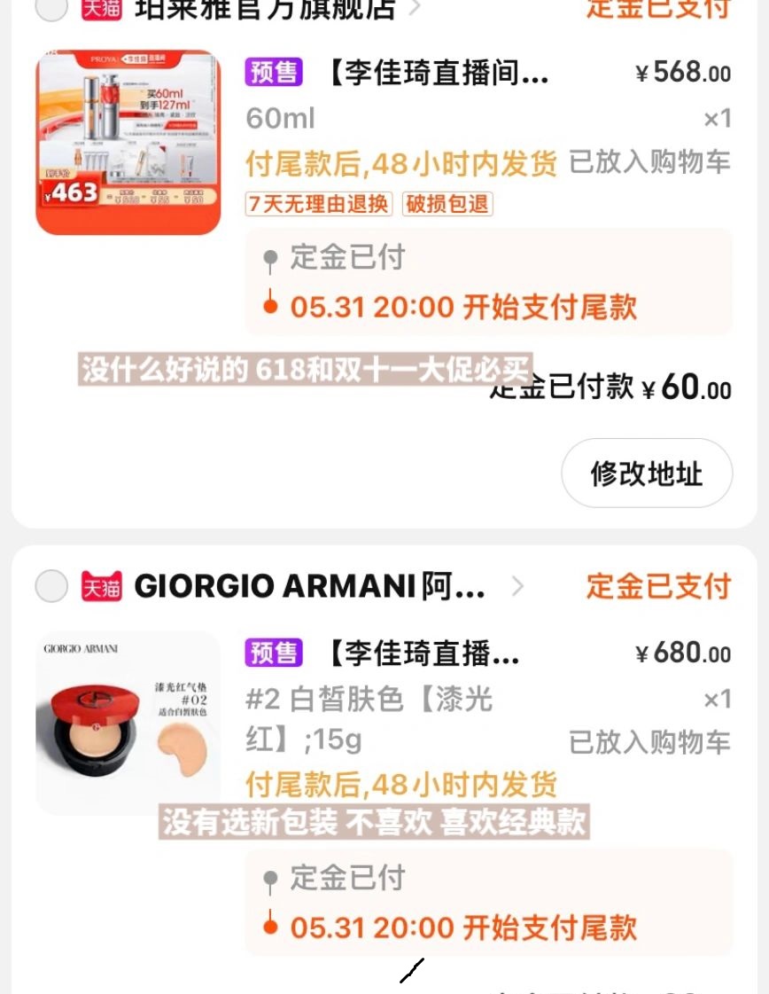 因为一直在读书很少逛淘宝了(李佳琦直播间依旧玩不明白………除了双抗和红宝石是八点后付的定金,前面的都是八点前就付定金了,不知道什么时候会上链接,所以到底要不要抢的?
