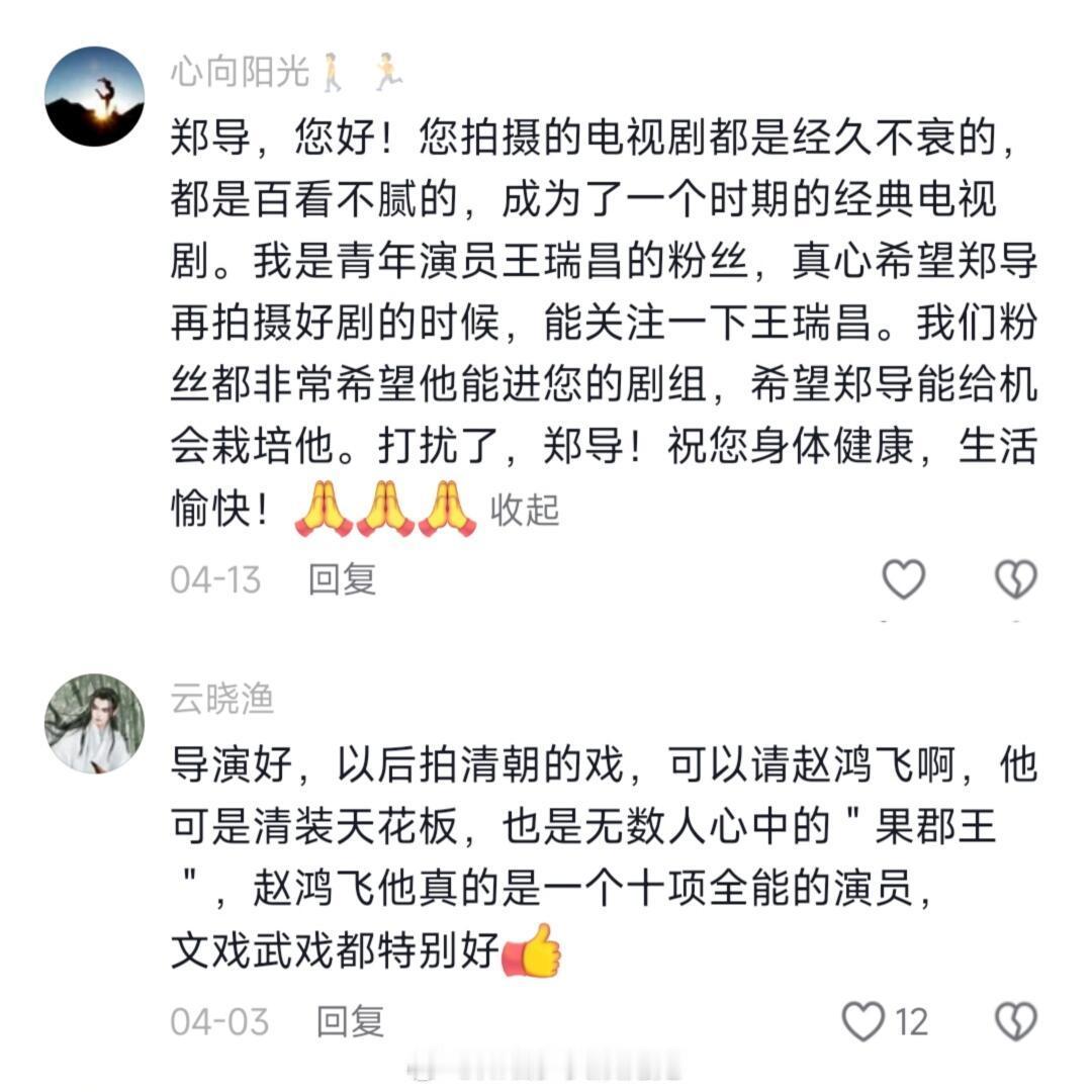 有点没想到的是,郑晓龙导演居然有某音账号,虽然只有2018年发过三个作品,但是依然有评论留言,其中包括很多当红艺人的粉丝们,在向郑导积极推荐自己的偶像。