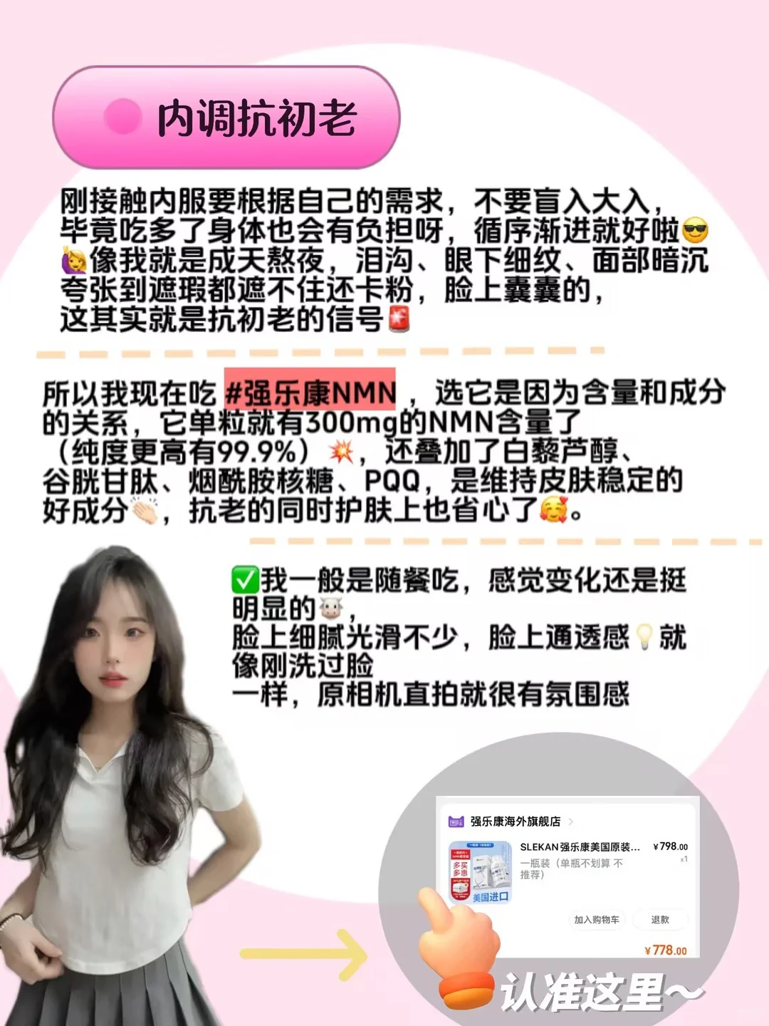 所以我现在吃 强乐康NMN ,选它是因为含量和成分的关系,它单粒就有300mg的NMN含量了(纯度更高有99.9%)💥,还叠加了白藜芦醇、谷胱甘肽、烟酰胺核糖、PQQ,是维持皮肤稳定的好成分👏🏻,抗老的同时护肤上也省心了🥰。