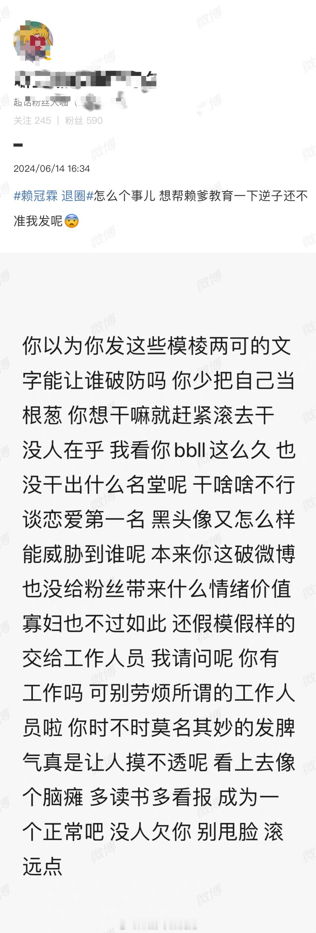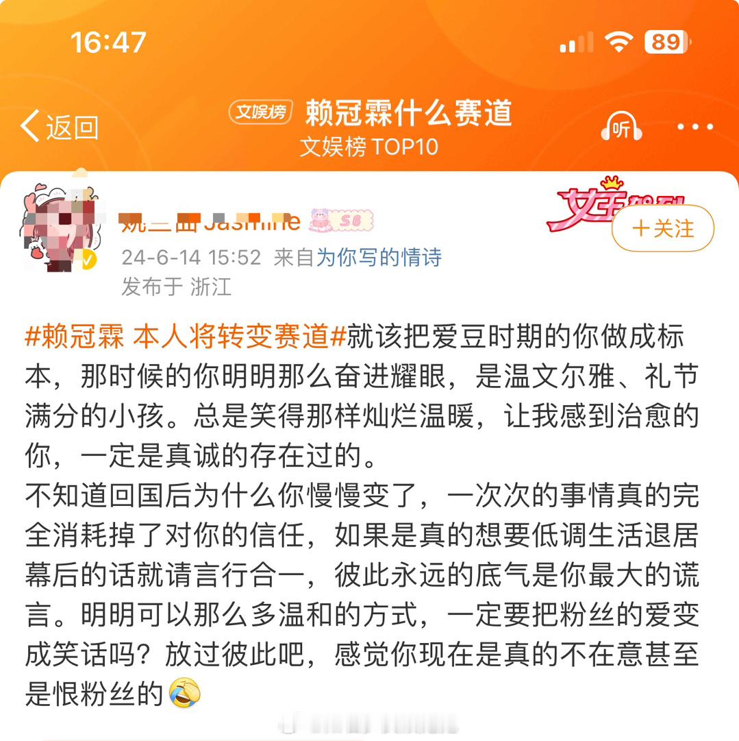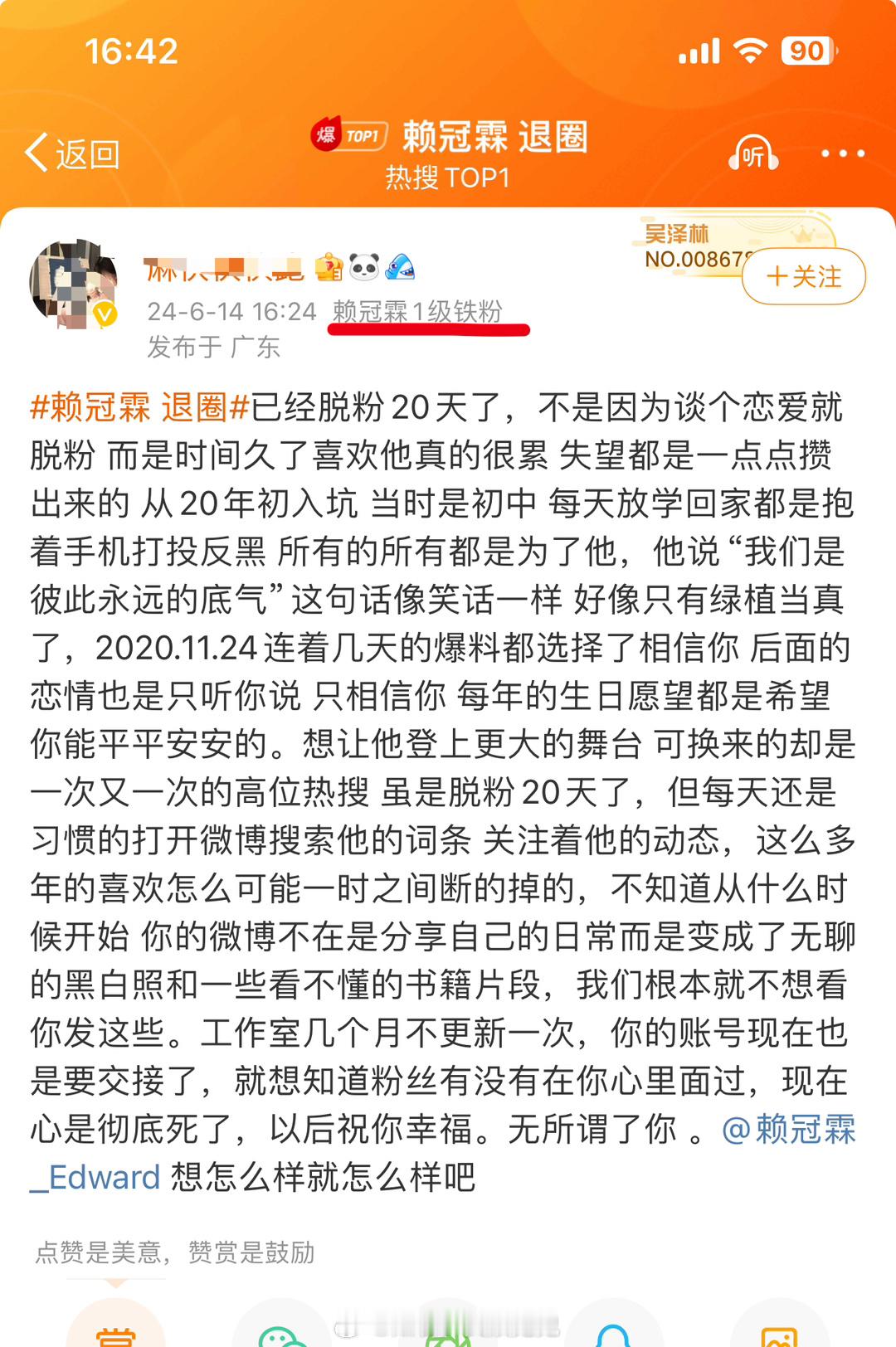 #赖冠霖粉丝发长文##赖冠霖粉丝发文#赖冠霖疑似退圈,粉丝发文质问赖冠霖:不喜
