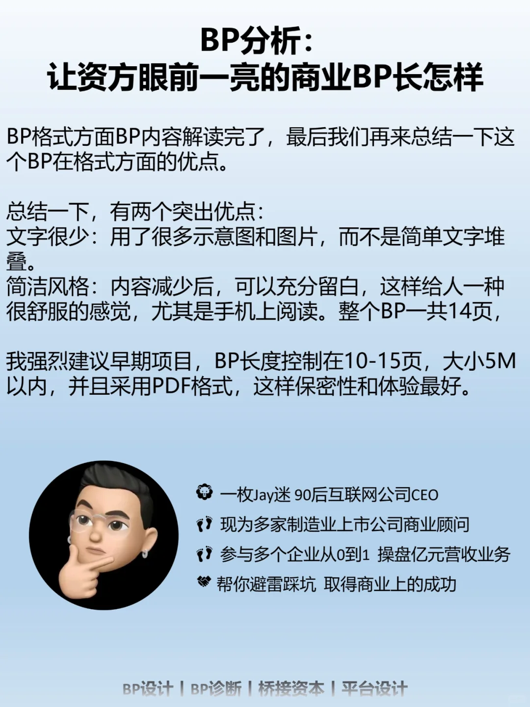 我强烈建议早期项目,BP长度控制在10-15页,大小5M以内,并且采用PDF格式,这样保密性和体验最好。