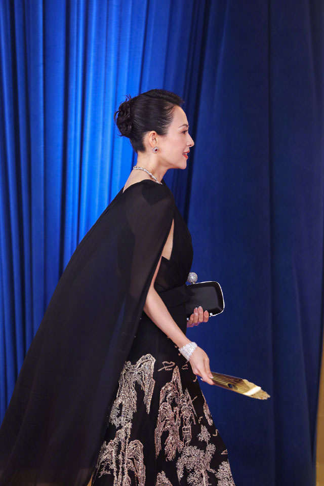 2024微博电影之夜,章子怡深V黑金长裙尽显好身材,披风加身气场全开。观众送上热