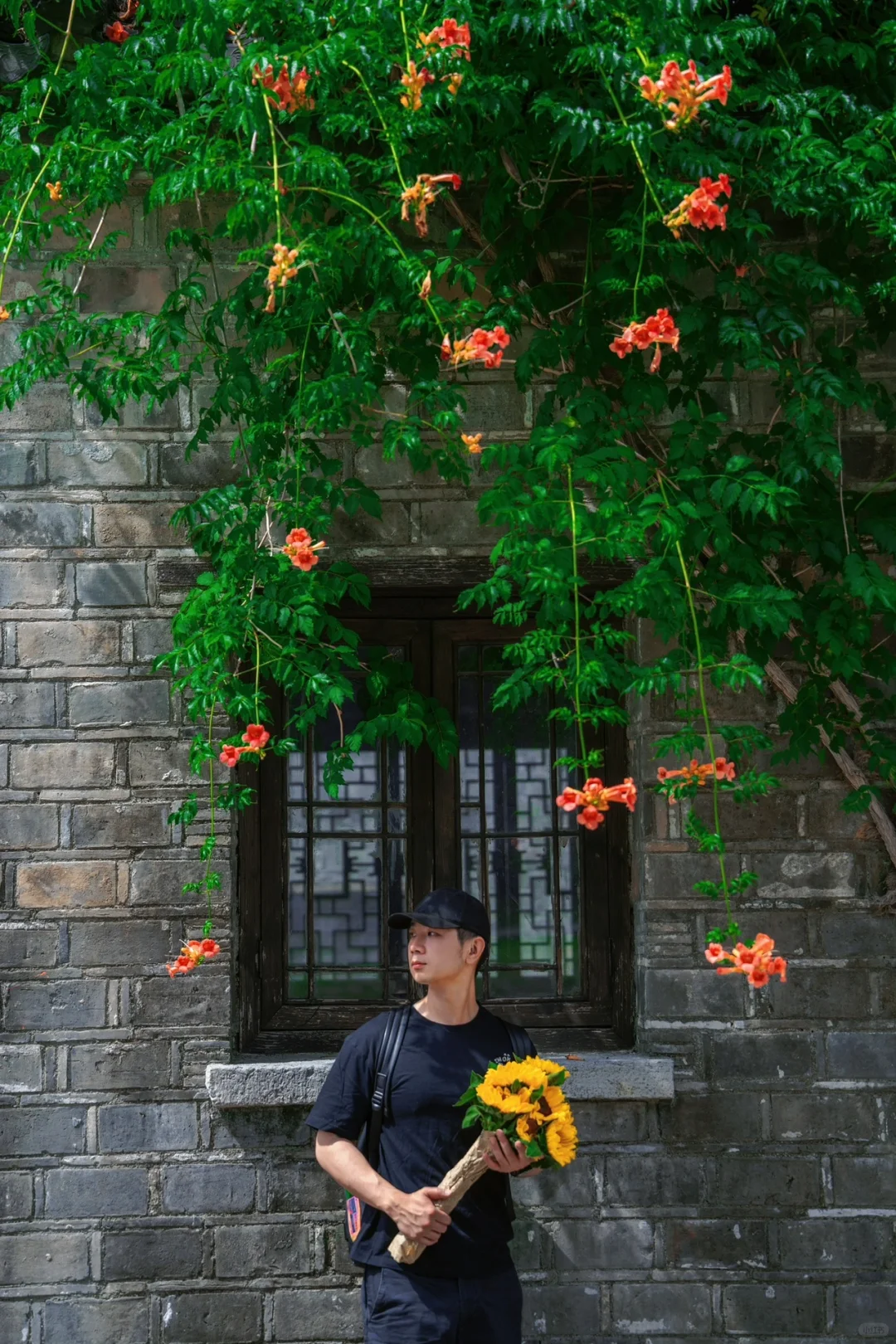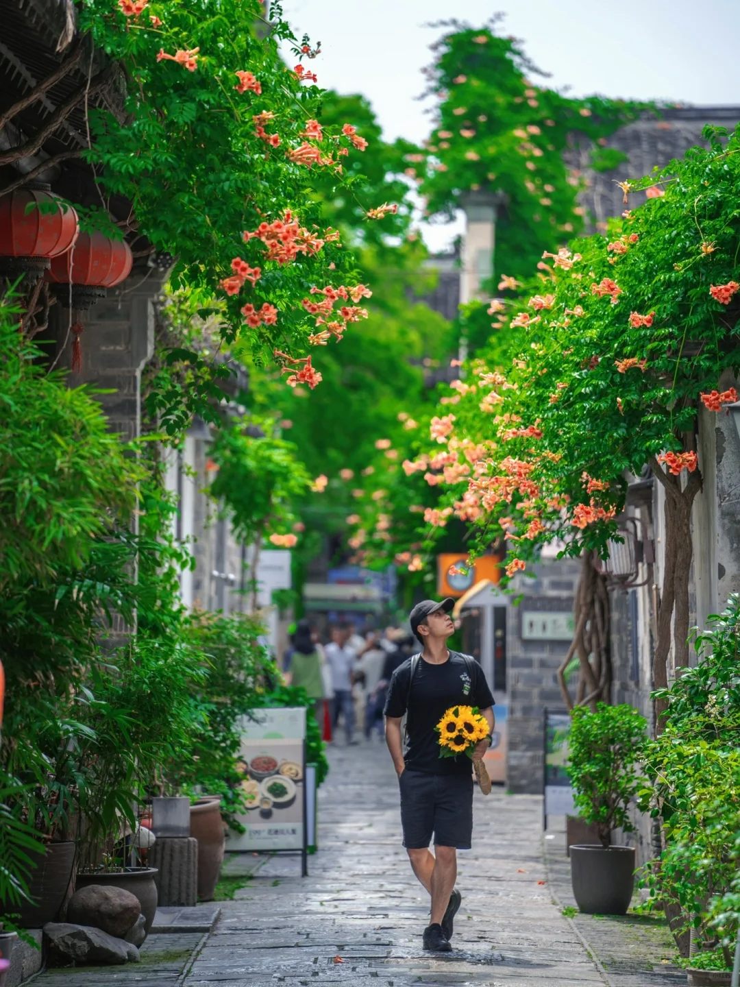 ▪这里凌霄花都已进入zui佳赏花期了,全开好了~雕花木质门窗、瓦片屋檐、飞檐墙角…都被蔷薇花点缀了,也有几面墙蔷薇花开如瀑布,怎么拍都好好看~花期很长,能坚持到八月份,可慢慢拍~