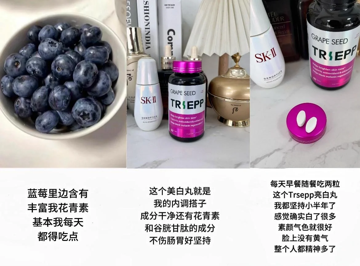 经常熬夜、脸黄、长痘、黑眼圈、易懒发胖、肤色暗沉的姐妹!!都去给我抗氧化+罗大伦老师养生三步走!!!我也是被学医的朋友狠狠种草内调了!调气→养血→不贪凉,搭配两粒亮白丸+早睡+泡脚+站桩直观效果↓: 1、皮肤干净无暗沉,早起不化妆素颜洗把脸就能冲出门 2、脸蛋红润感变强,P2不打腮红阳光下也红扑扑的毛桃子🍑一样 3、精力起来了,并且身体也比之前白了一个度 . 我学习并总结的罗大伦老师养生方法↓ 首先是调气 百病生于气,尤其是咱女孩子,不开心,经常叹气,脸上长痘、ym前脾气大,还有面相变丑,都和生气有关 ①拍八虚八虚的腋下对应gan气,拍拍心情立马舒畅不少 ②泡脚就是红花泡脚,每次15-20min,微微出汗就ok ③桑葚玫瑰乌梅饮酸酸甜甜的,我压力大、情绪差的时候喝的比较多 . 然后学会抗氧化像我们女孩子熬夜、看手机、暴饮暴食,焦虑内耗、特别容易在体内堆积黑色素,如果没有办法及时排出去,就会沉淀在脸上,身体上,导致熬夜脸严重,鼻翼嘴角暗沉更加的明显,还有肤色不好,穿什么衣服都不好看 ①吃蓝莓,桑葚里边的原花青素含量特别足,酸酸甜甜还好吃 ②亮白丸我尝试下来zui直接的抗氧化方式,就是吃的这个Trsepp亮白丸,是主要它成分比较干净,并且身体需要的原花青素,谷胱甘肽等元素含量比较足的原因,作用到咱的皮肤、头发、指甲、全身各个角落的变化也更直观,还自带VC,VE,帮助代谢散黄气,同时还不会伤脾胃~ 吃不到2瓶就明显感受到气色上来了,皮肤透亮不少,黑眼圈散了,吃到现在皮肤越来越光滑细嫩,素颜不化妆脸蛋也白里透粉!!原相机直出也不会掉链子,口红腮红都省了,拍照更有杀伤力~ 皮肤变好后整个人自信明媚好多,精气神足,每天都正能量满满像个小太阳🌞 . 闭环是生活习惯 ①不贪凉,“寒则凝,淤则堵”,夏天少吃冷饮,远离体寒和痛经 ②早睡,熬夜会影响骨骼造血 ③站桩,每天10分钟,精气神和体态都会有很明显的变化! ④按摩耳朵,手脚冰凉的我每次按完浑身都是热热的!能感觉到气血畅通! . 坚持养生,每个姐妹都能养出气血充盈的健康美!
