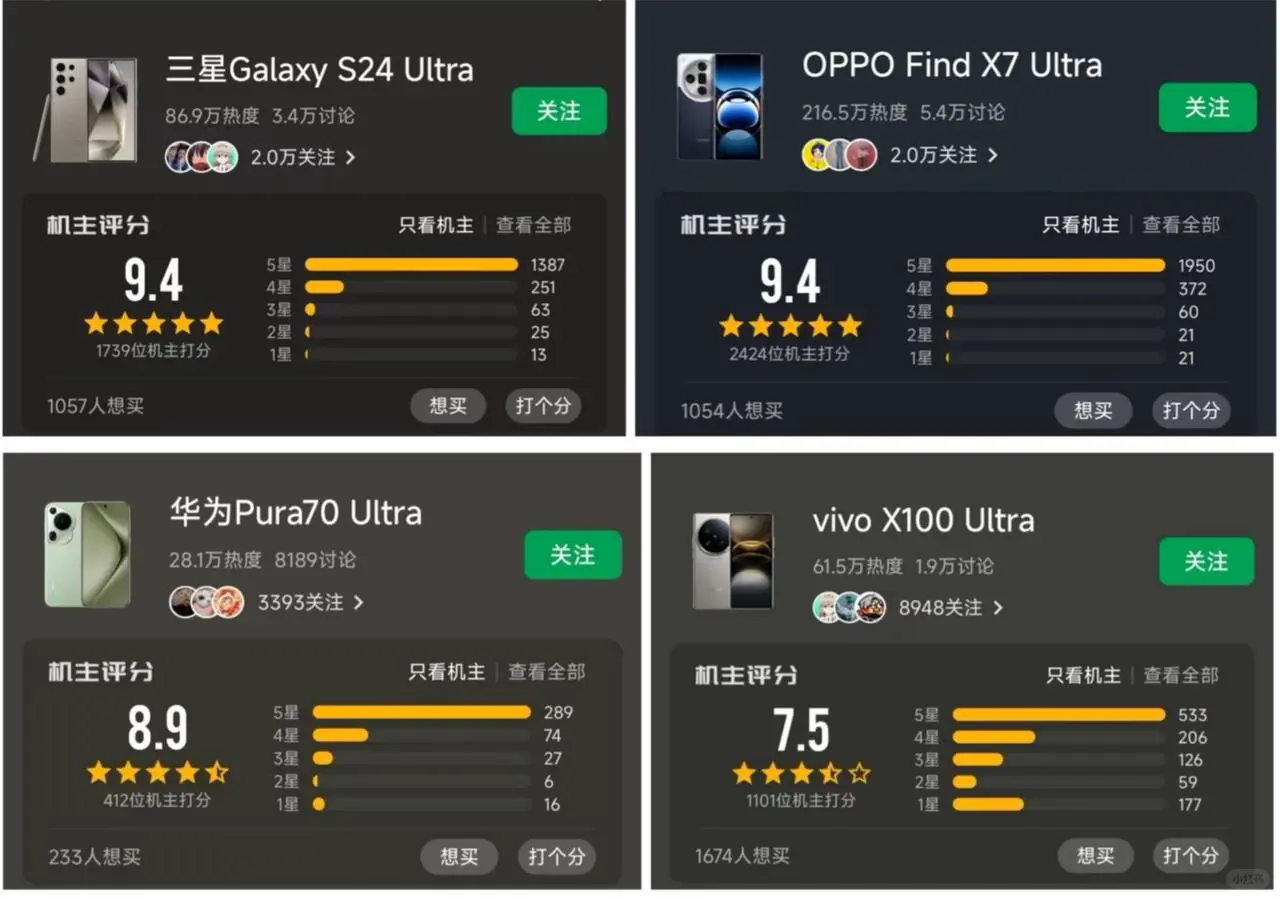 👍还有就是口碑,如酷安上,三星S24 Ultra和OPPO Find X7 Ultra的机主评分是最高的,好用不好用一目了然。