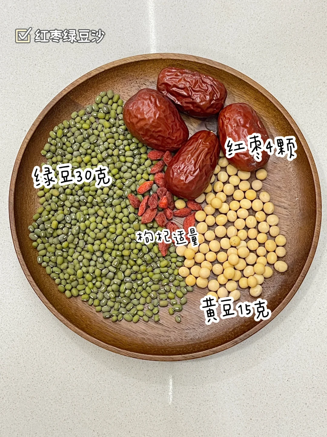 🔹绿豆30克、黄豆10克、红枣4颗、枸杞适量