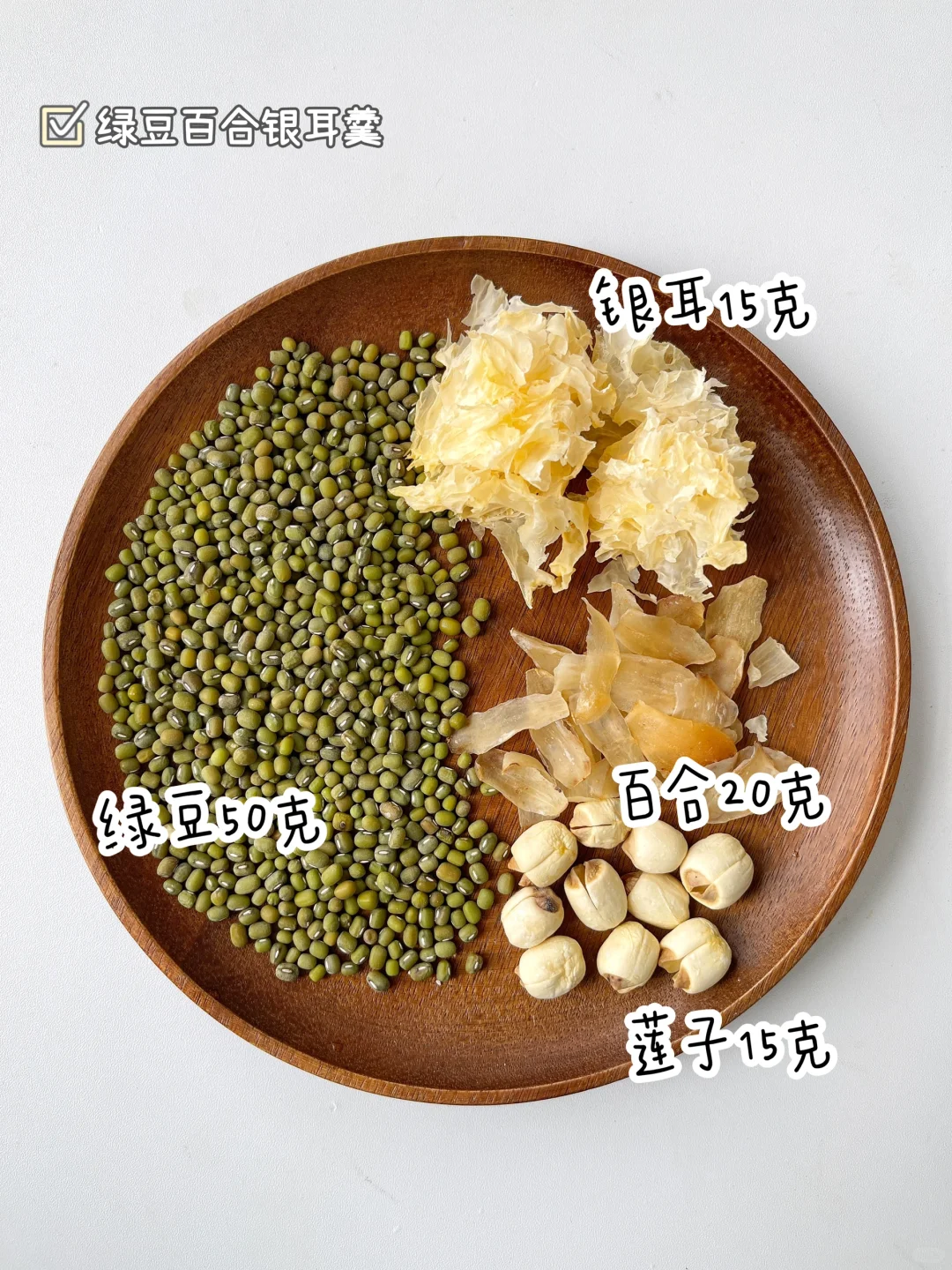 🔹绿豆50克、银耳15克、莲子15克、百合20克、清水400毫升(银耳、百合需提前泡发)