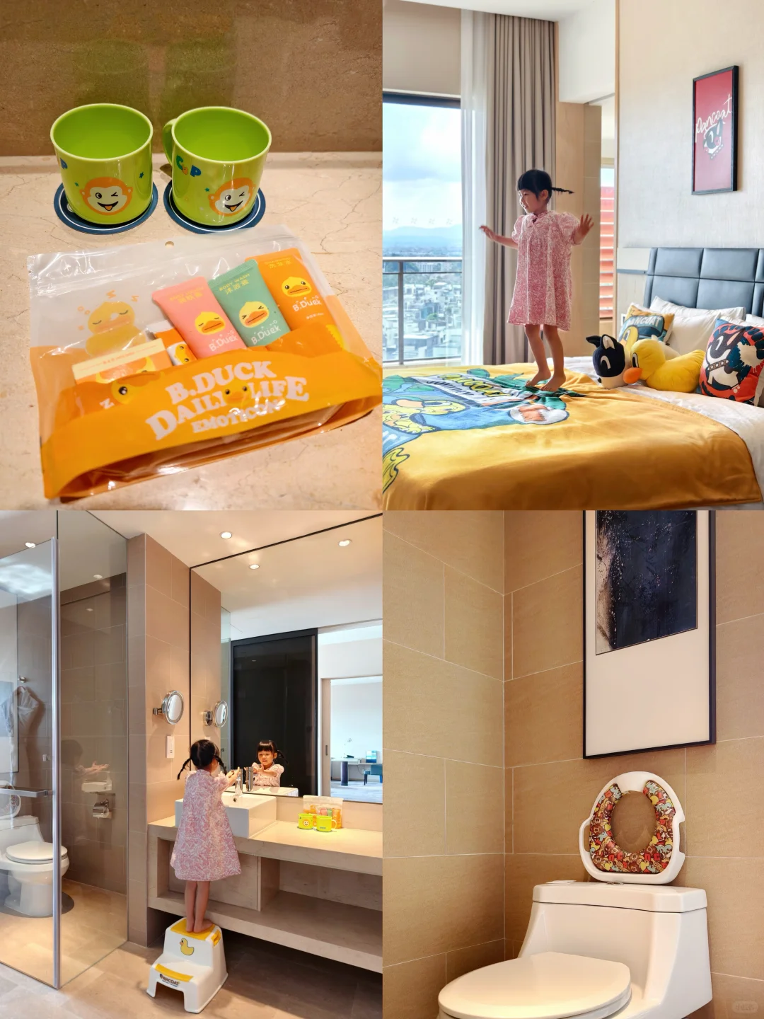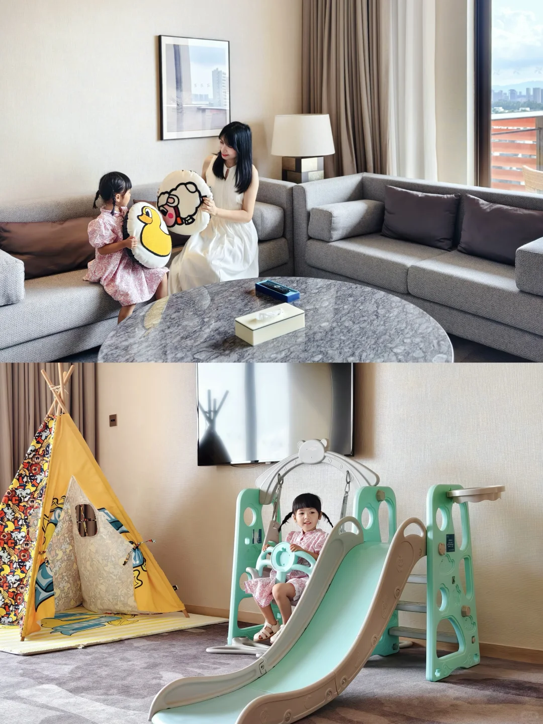 他家的亲子房太懂小孩子了吧💕到处都是可爱的小黄鸭元素,有小帐篷、滑梯🛝在房间🏠都能玩好久好久😝而且在房间有超大泡池,一边看📺一边玩水,爱了爱了~