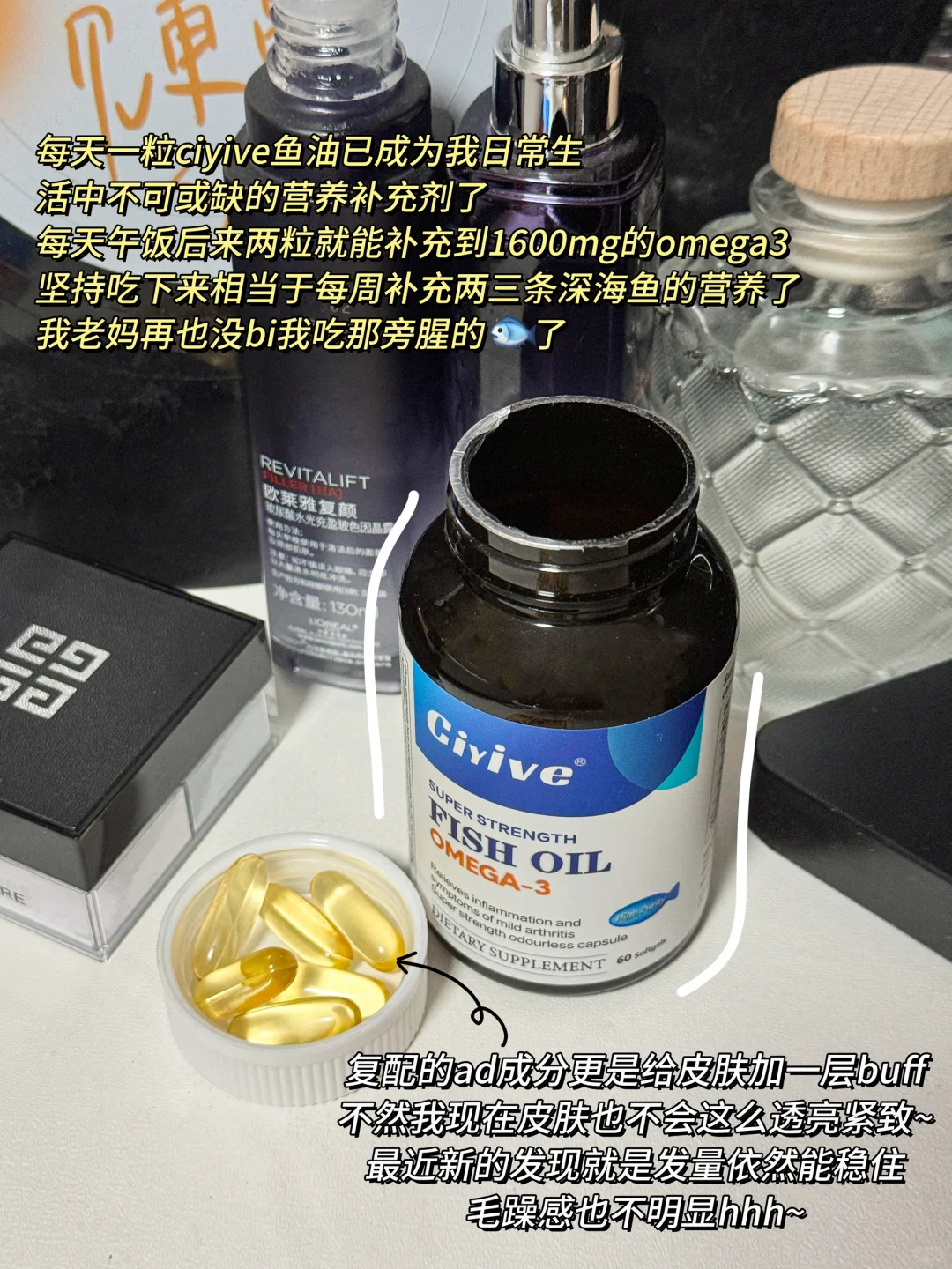 挑来拣去的就留下Ciyive鱼油,米国的一个小众牌子,用料足也没啥杂七杂八的成分,反正我吃下来没有出油、冒嘎达的反作用,反而皮肤、头发的质感肉眼可见的上来了~