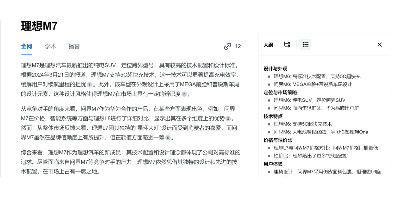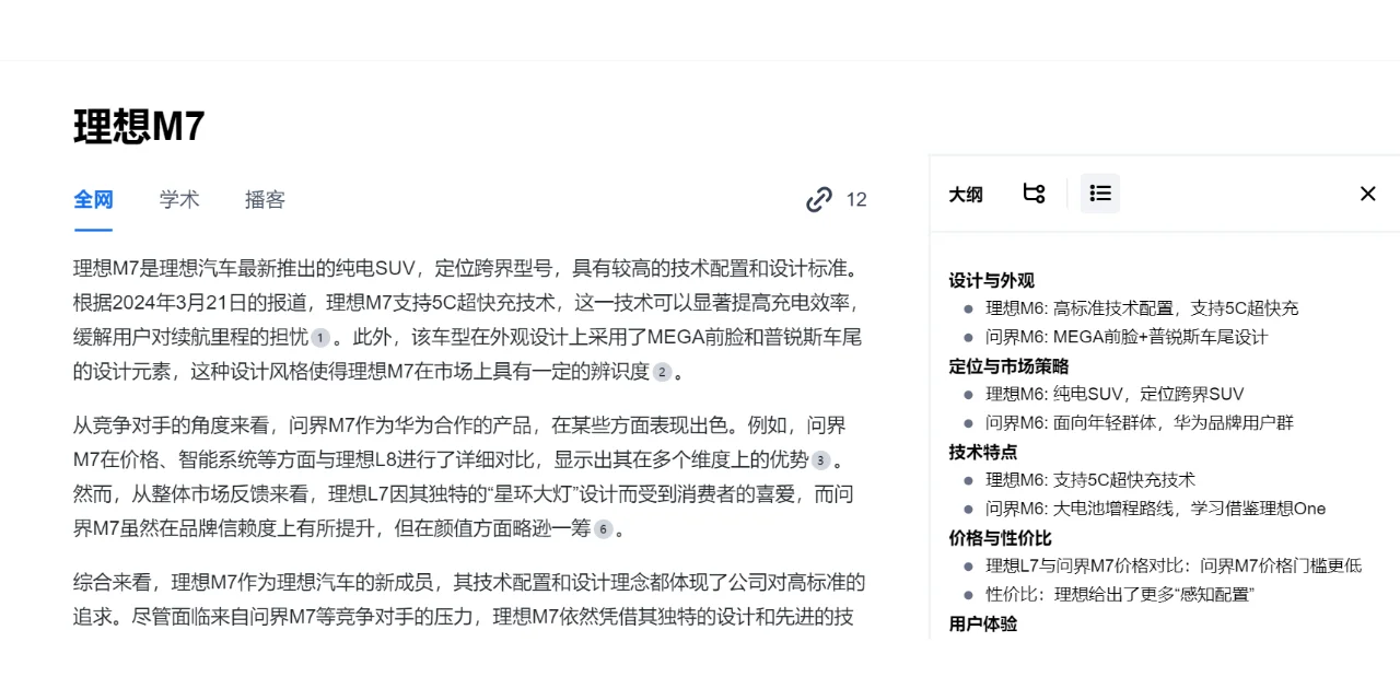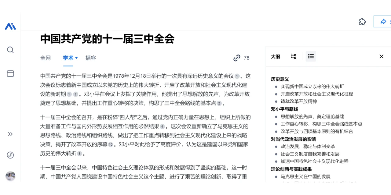 学术:检索学术问题,可以自动生成大纲和参考文献,相当于给一个题目就能写出一篇小“论文”。写论文的时候也可以在上面检索,看一看思路有无可以借鉴的地方。