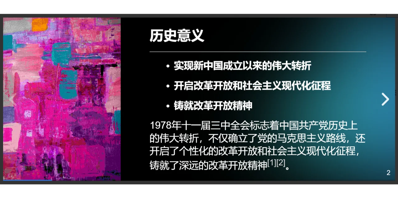 以检索“十一届三中全会”为例,它会把与之相关的所有知识点、内容以及相关事件进行整合,还可以自动生成思维导图和演示文稿。
