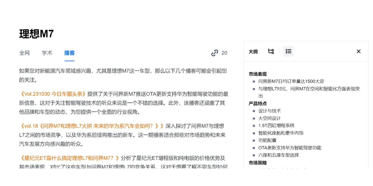 播客:可以整理出与检索问题相关的播客内容,轻松“听”答案。