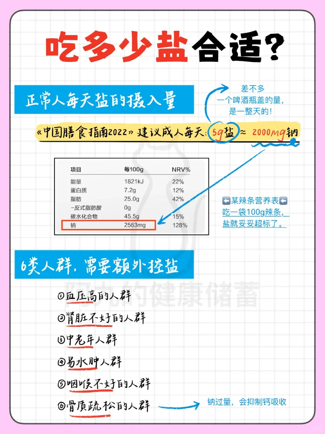 从《中国居民膳食指南》2016版到《中国居民膳食指南》2022版有个明显的变化,就是盐的摄入量从6g减到了5g,虽然只有1g的变化,但非常值得我们去重视,因为我们大部分国人对钠的摄入仍然是超标的[捂脸R]