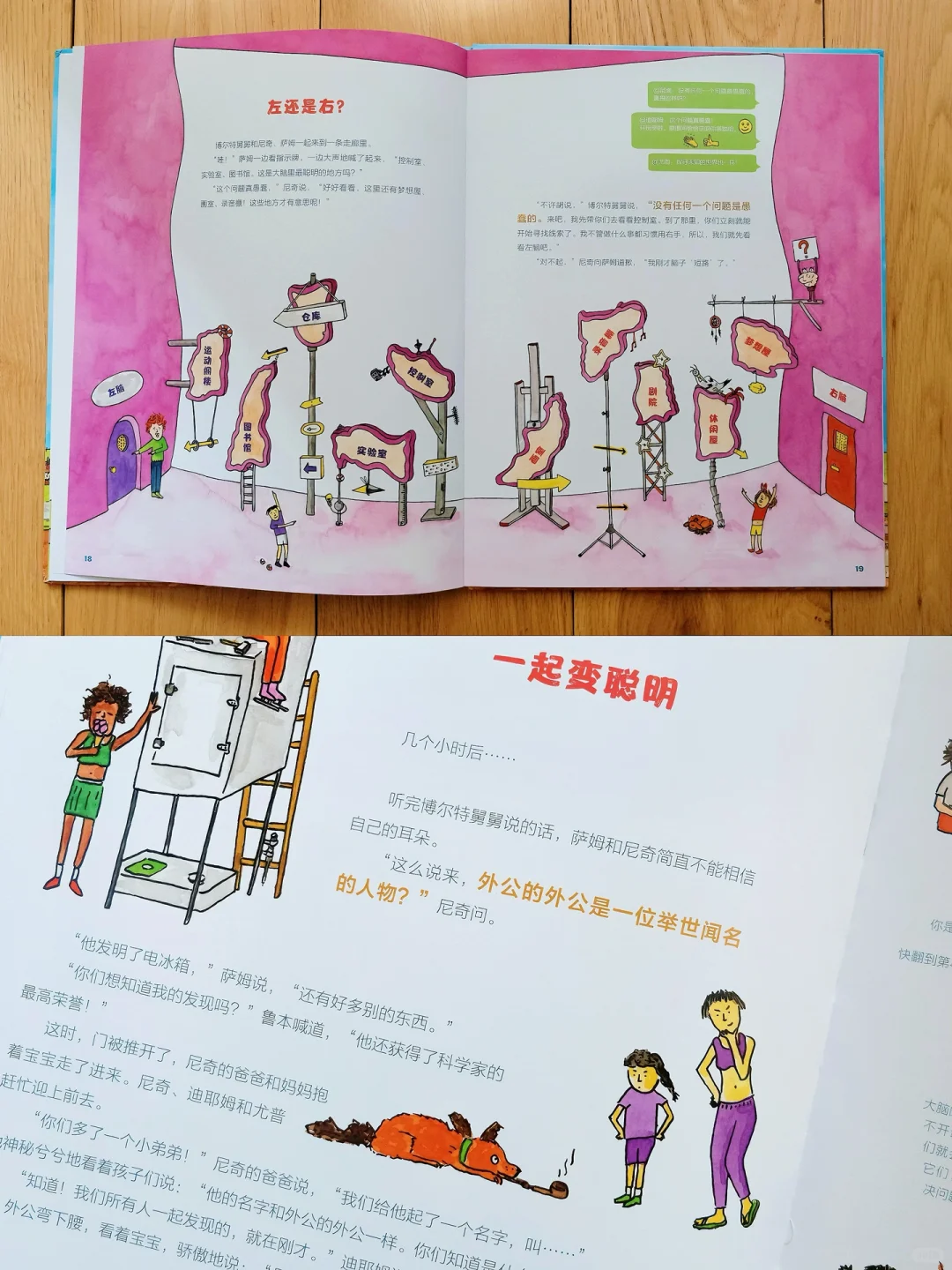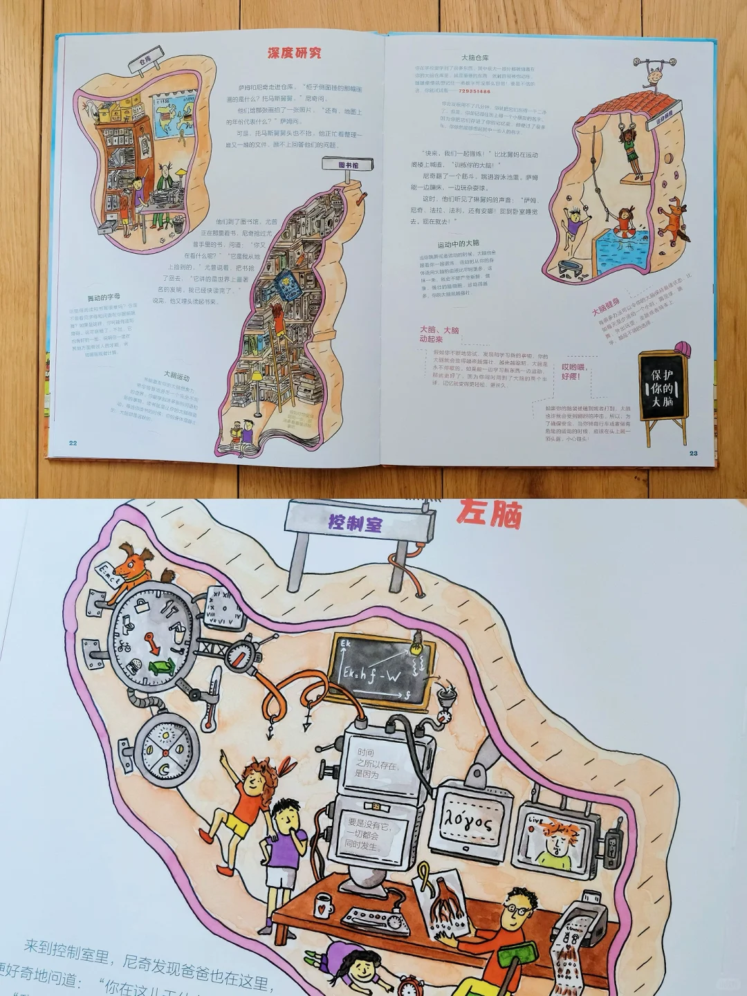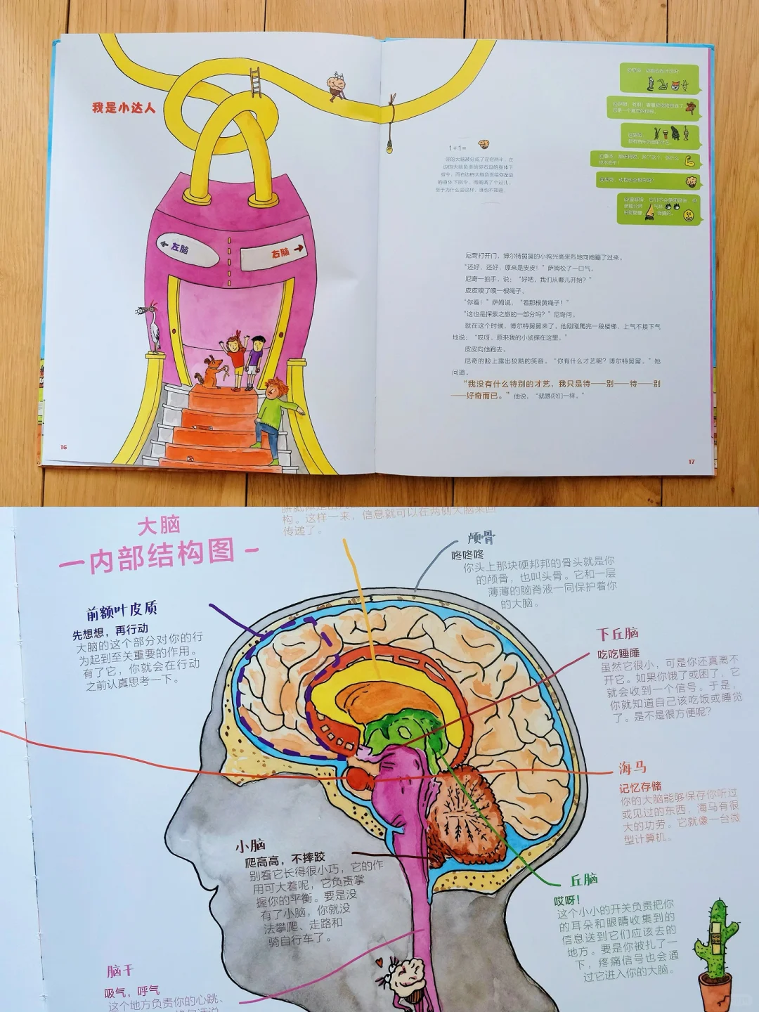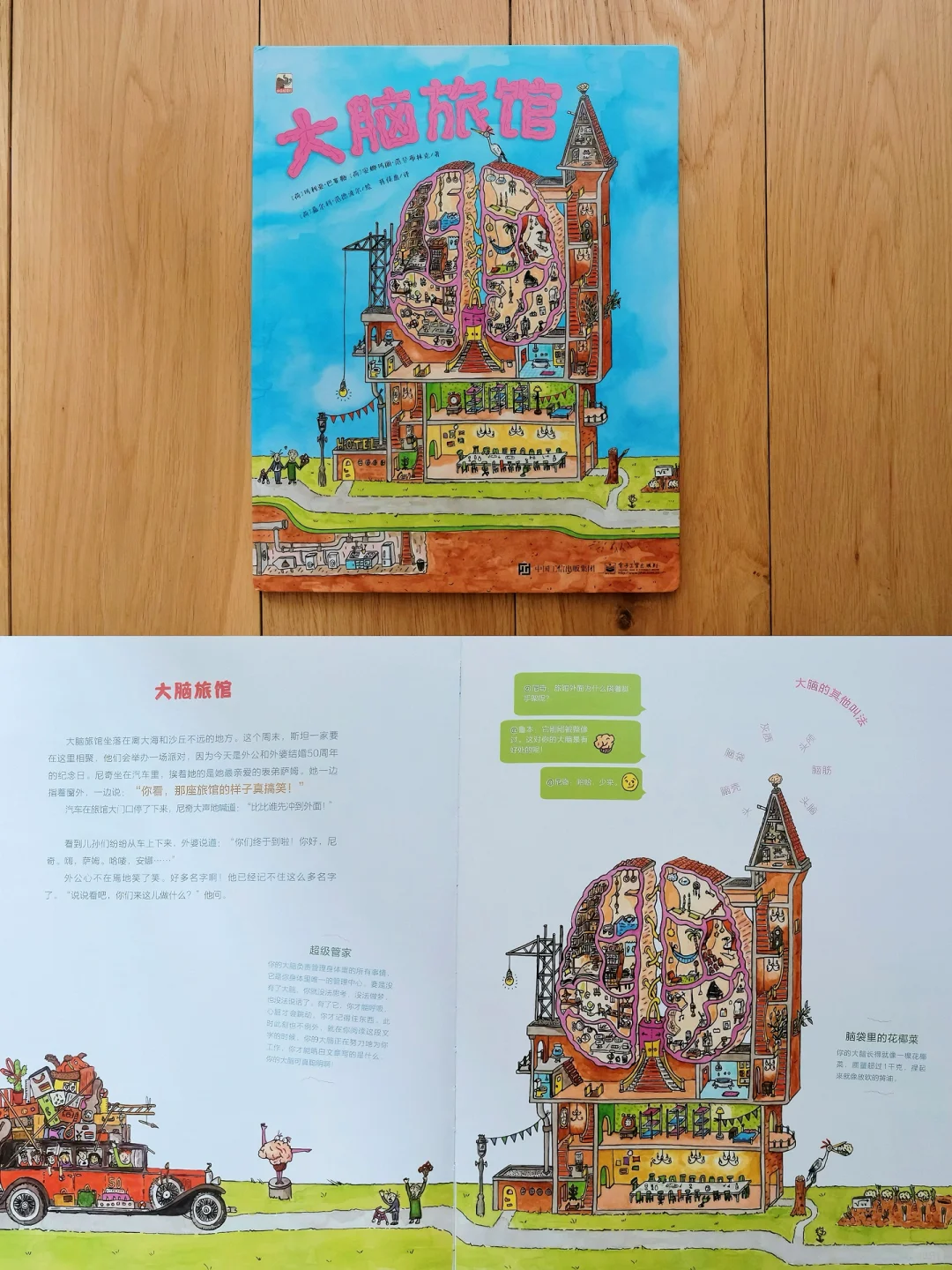 把大脑比喻成“旅馆”,介绍了不同区域以及它们各自负责的任务,如思考、记忆、情感等。