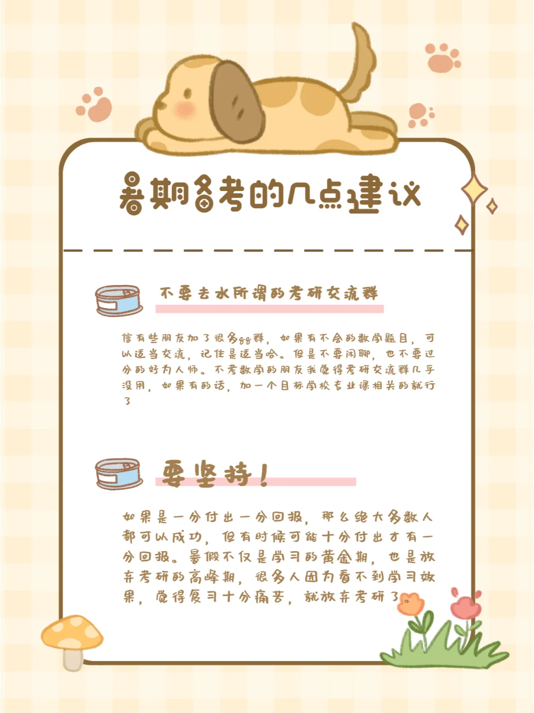 六、学习之外,同时也要注意防暑降温,也别一直空调直吹,多喝点水,暑期天气可能会比较干燥。另外学习过程中需要休息的话,建议走动走动,休息休息眼睛,吃点东西,不要玩手机,不要刷微博,这样很容易沉浸在里面,五分钟十分钟就过去了。