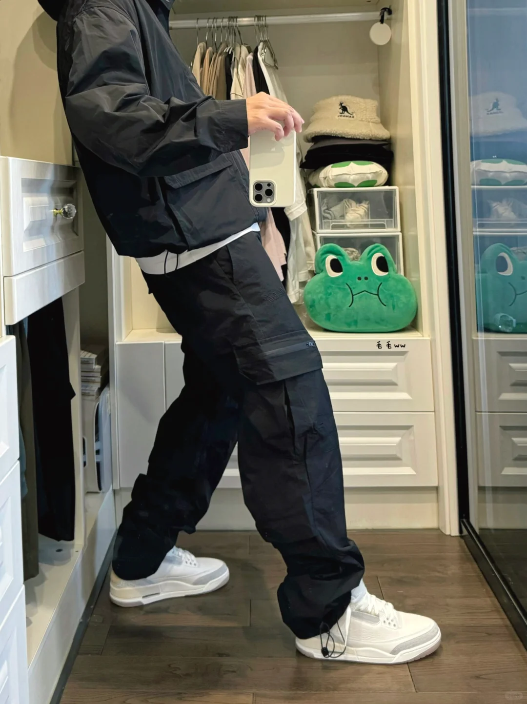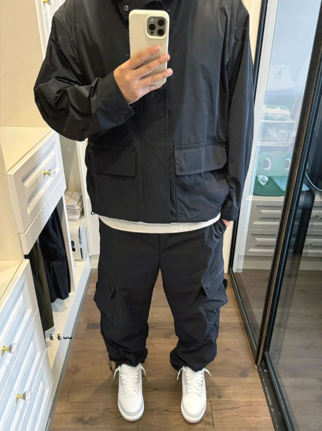 -户外通勤的思路会延续下去,搭配足够容易,冲锋衣工装裤,实用性方面,三防不错 . -一套黑白叠穿公式,黑色一套,剩下交给白内搭白球鞋,总之就是,怎么简单怎么来 . —————— . ✏️本人178cm75kg 球鞋尺码265mm(正常EU42) . 💭以上均为我个人观点,不喜勿喷,欢迎讨论。