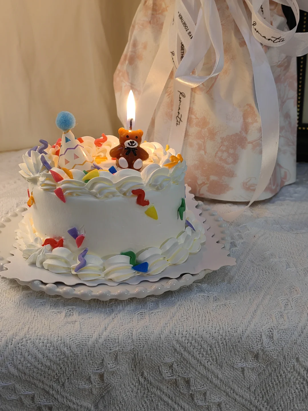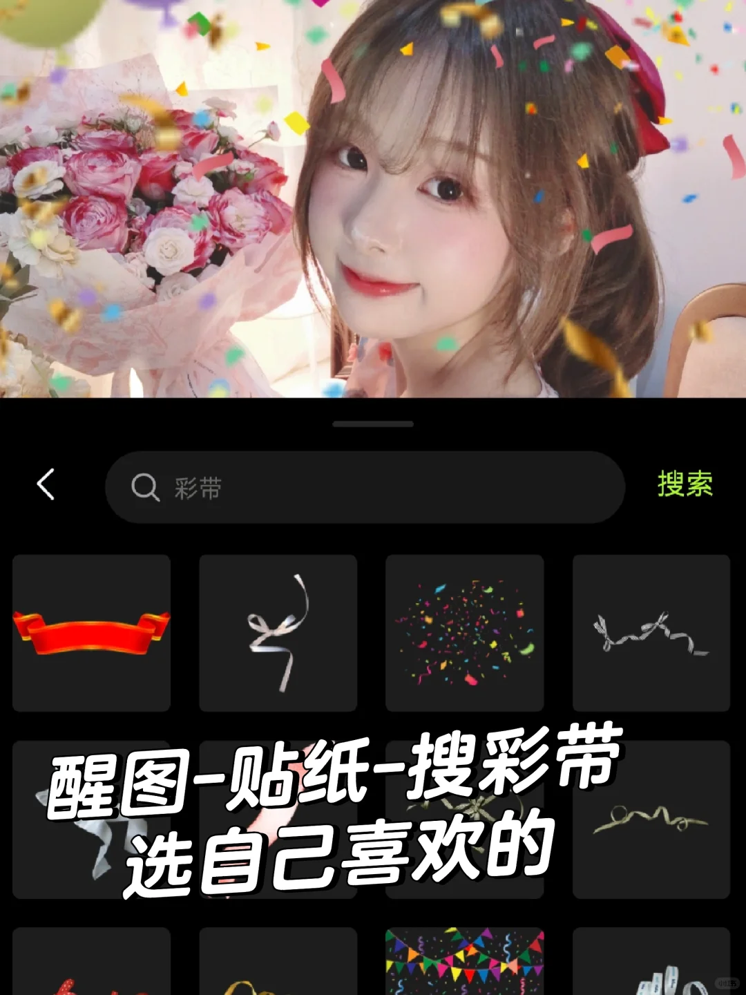 在贴纸里搜彩带就可以啦,还可以加气球上去 可以选多种彩带叠加一下会比较自然 再用笔涂掉遮挡脸部的贴纸,露出脸 拍照的时候可以在身边放一盏台灯,比较有氛围感 蛋糕的蜡烛可以先不点,最后p上点的时候的火光就好啦