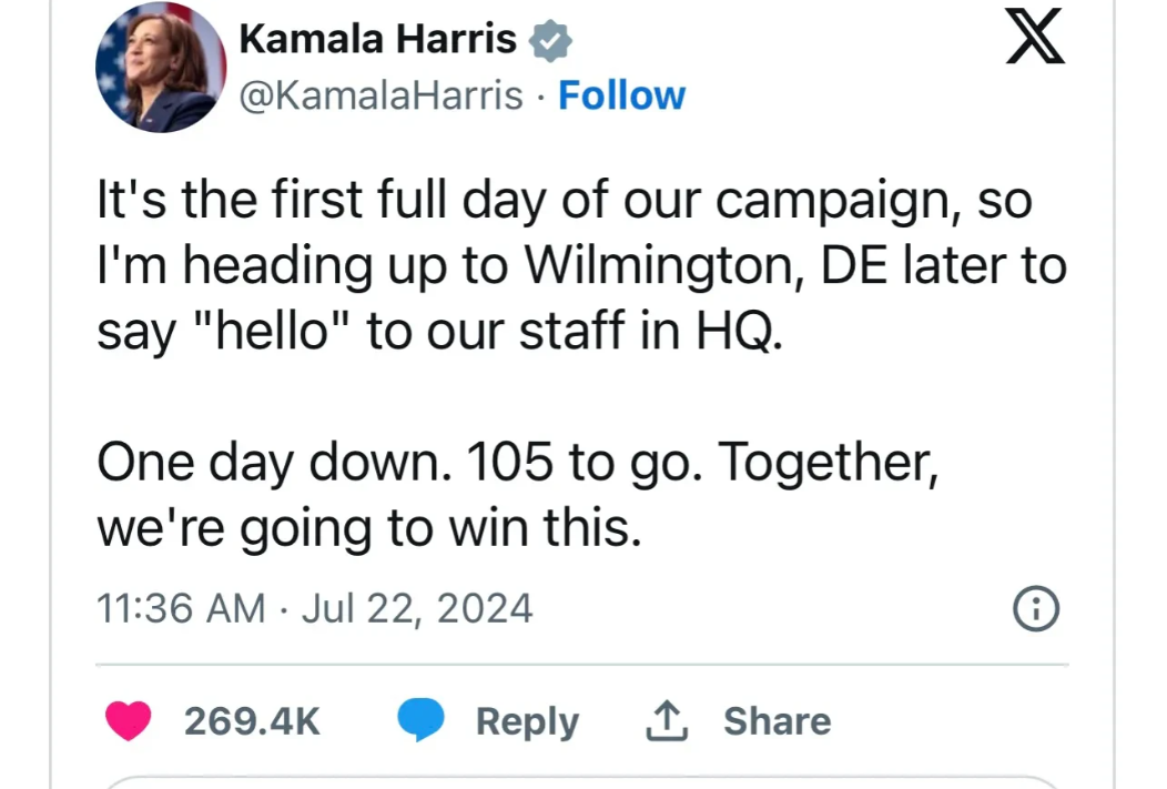 紧接着,哈里斯马不停蹄地赶到特拉华州的拜登竞选总部,全面接手拜登的竞选团队,准备迎接新的挑战。